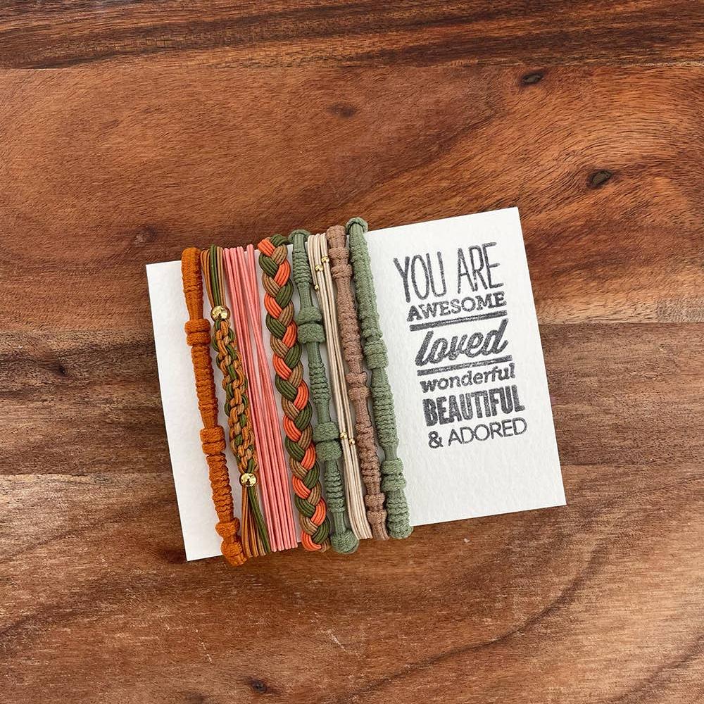 These Boho style hair ties are unique, decorative and oh so cute! Whether using your hair ties to hold up that luscious ponytail or stacking them on your wrist to add some outfit pizzazz, you can't go wrong. Hair ties come on a card complete with words of encouragement that will surely put a smile on her face!