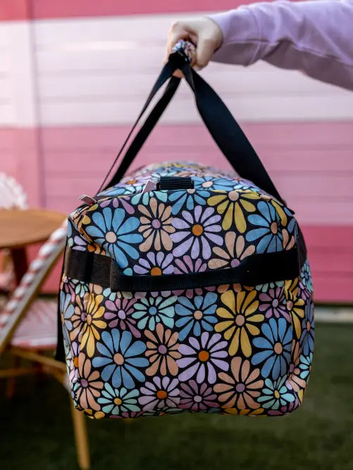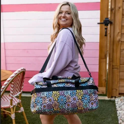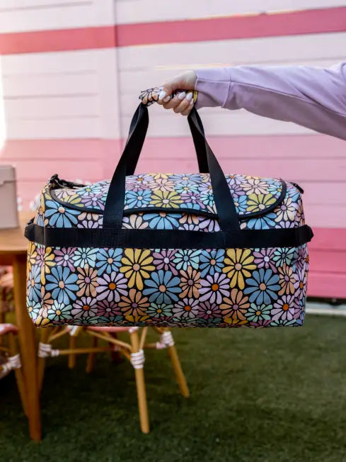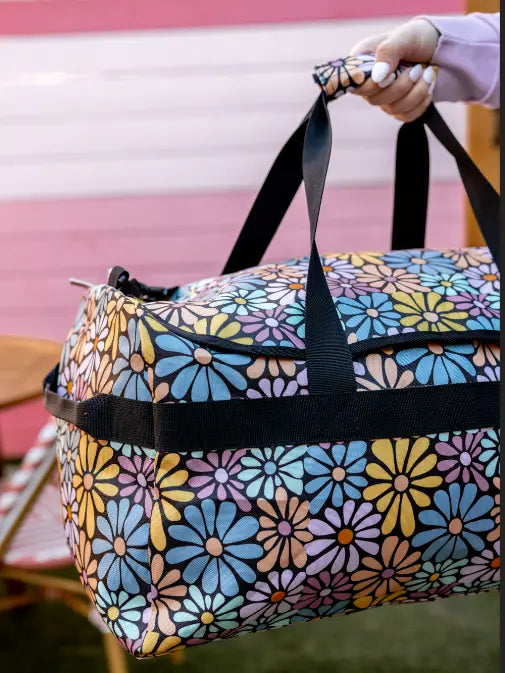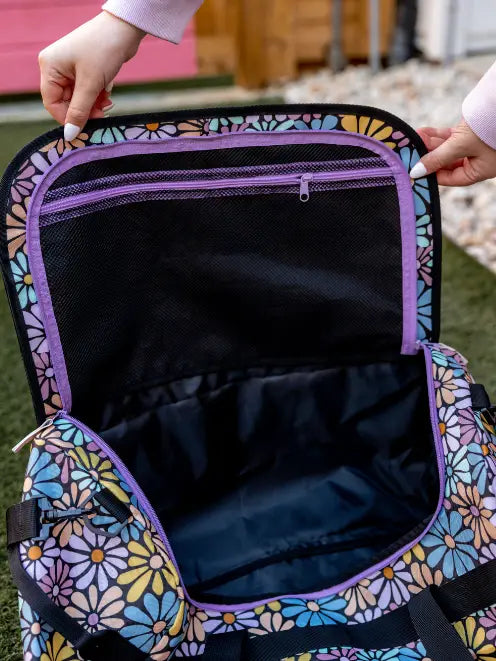 12 1/2" wide x 12" tall x 11" deep shell: 100% polyester inside is completely lined with 100% polyester taffeta printed multicolor daisy pattern 2 top handles measure to 14" tall crossbody strap measures 54" at longest length top zipper wraps around 3 sides for a fully open top top flap has a mesh zipper pocket that measures 15" W x 10" H both sizes have easy to grab 8" wide handles holds up to 20-25 lbs