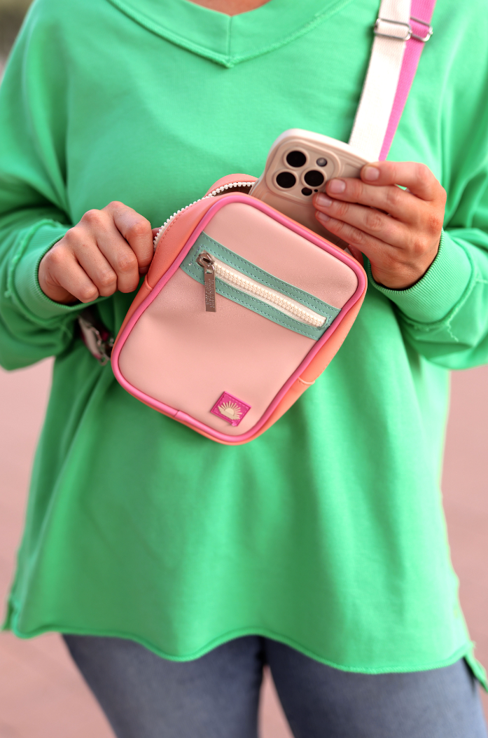 Pink/coral/mint Material: PU Vegan leather Front Pocket is 41/4" W x 5" H Main compartment is fully open with 1 pocket at the back back pocket has elastic trim to keep items inside. Measures 5 3/4" T Can Hold up to 5 lbs
