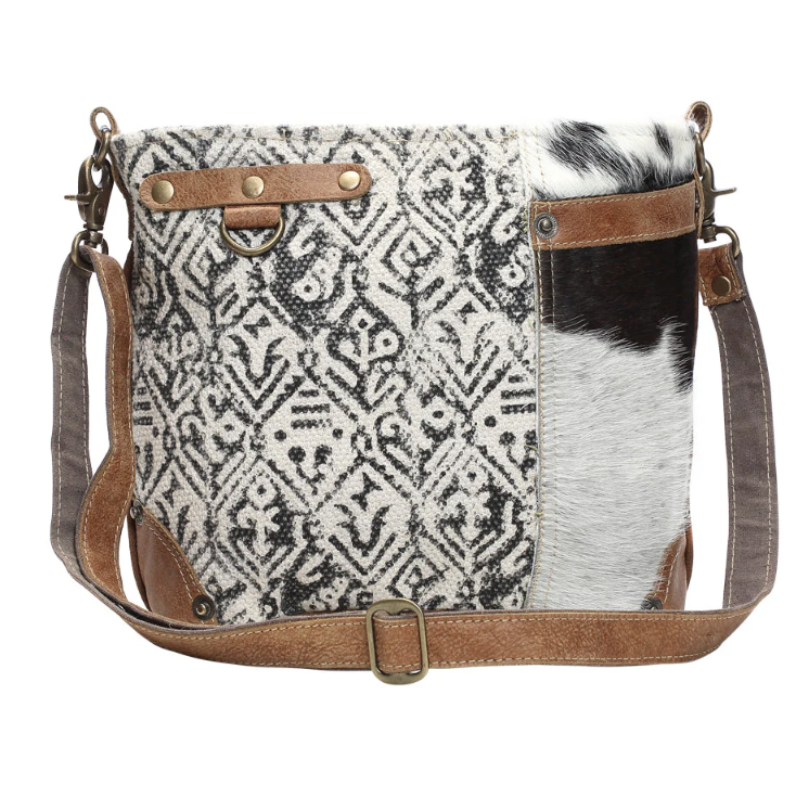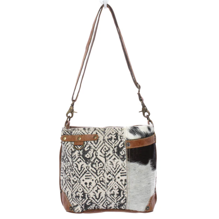 Pure handmade bag with a combination of cotton rug, canvas and hairon stripe. The floral print on the canvas looks beautiful and comfortably holds your daily essentials.
