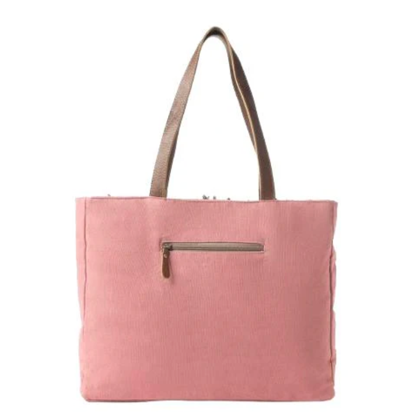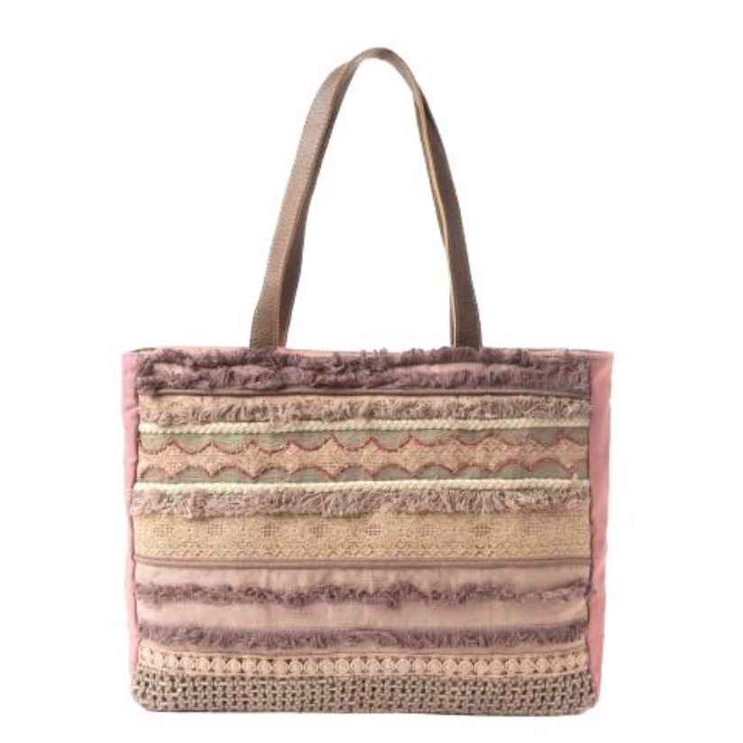 A bag you'll love as you embrace its rustic romance! this layered tote features textural bands of lace, fringe, and embroidered trim in earthy neutrals and sage green. A touch of dusty rose adds feminine charm to this bohemian-inspired design. The rose upcycled canvas back has a zippered pocket for convenience. Zipper-close top. Shoulder straps are in matching leather.