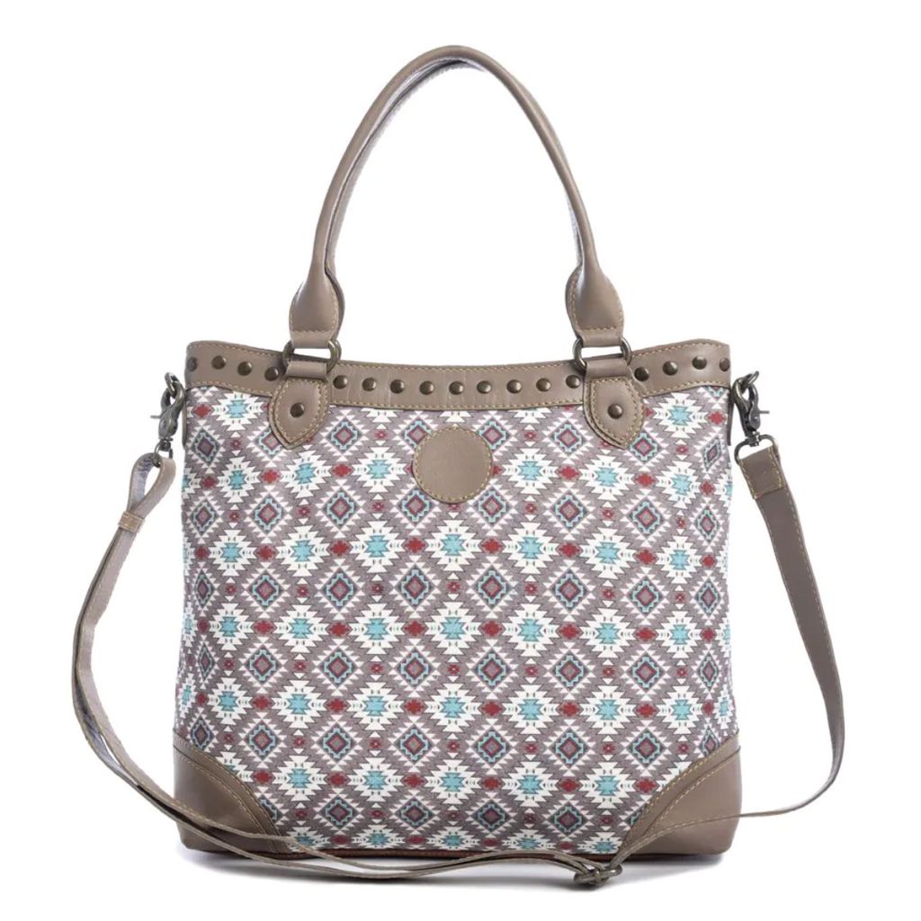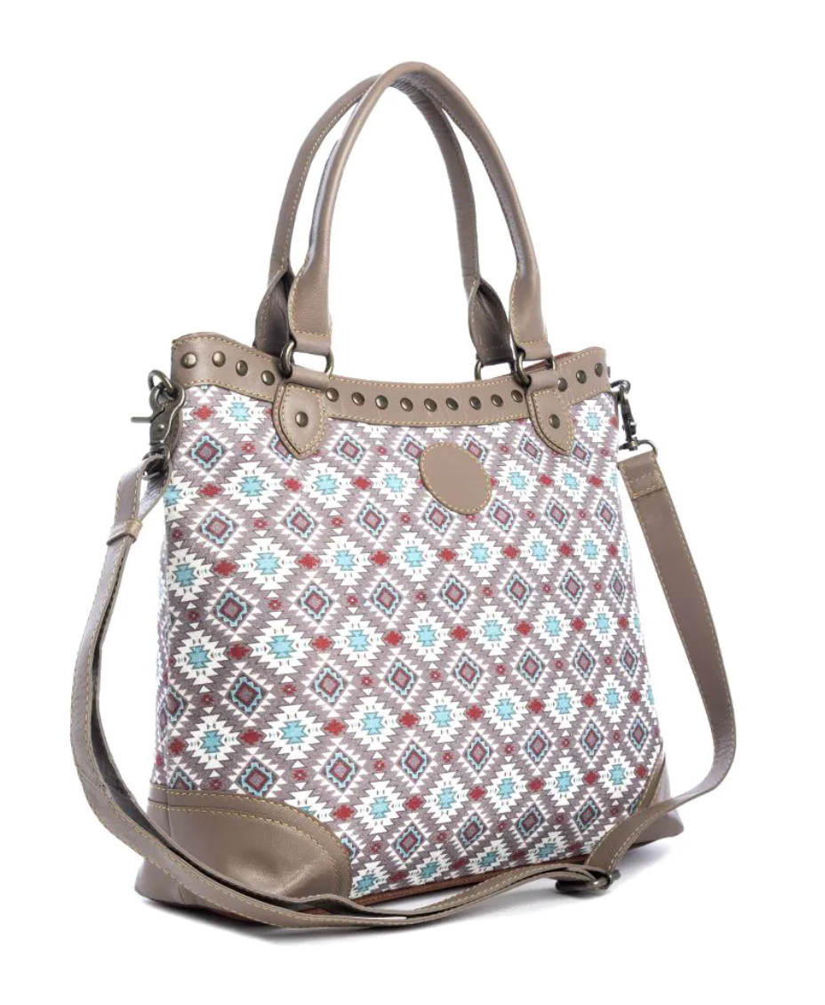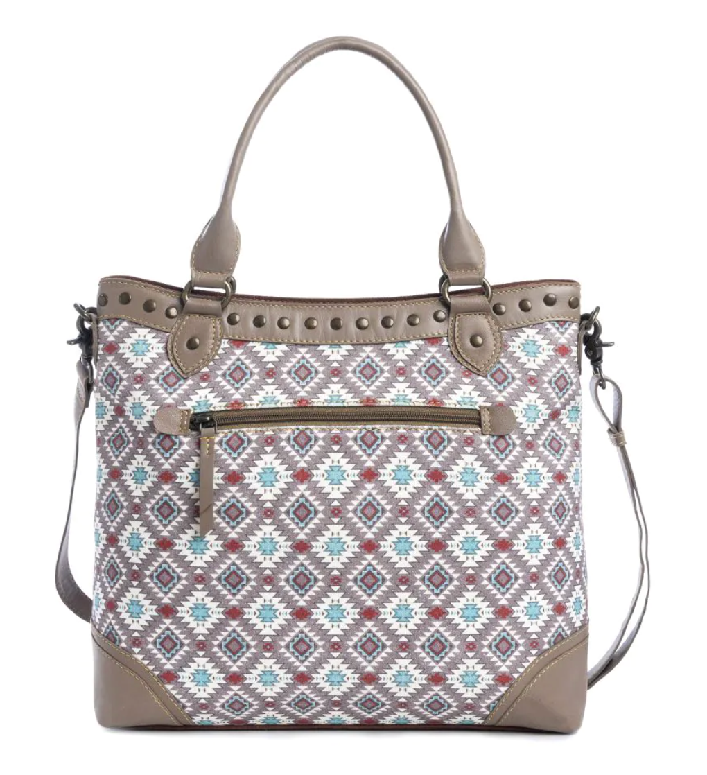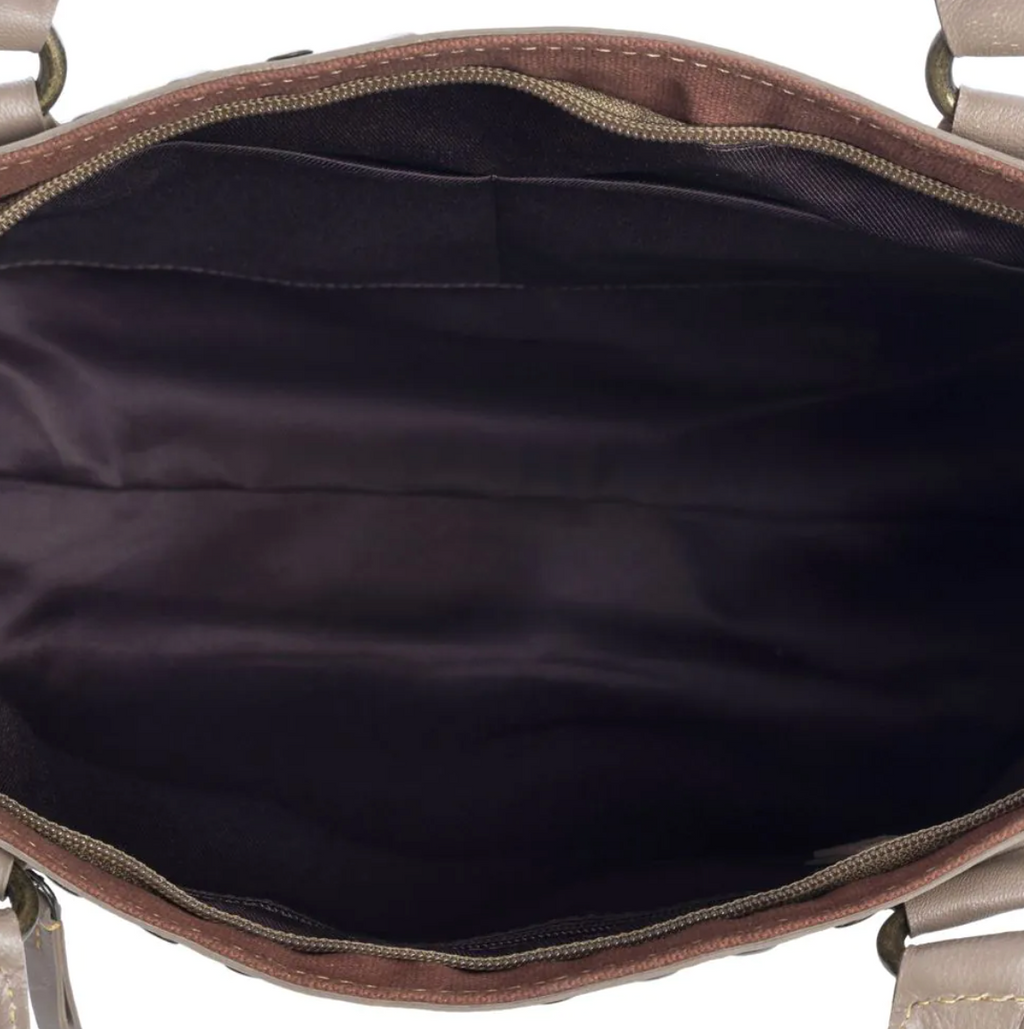 An amazing blend of textures and colors make this a delightful bag! Beautiful smoky taupe leather embraces the lovely colors and pattern of the upcycled woven canvas. Special metal stud accents complete the look. The back features a extra zippered pocket. Durable, adjustable shoulder strap and stitched carrying handles are in matching leather.