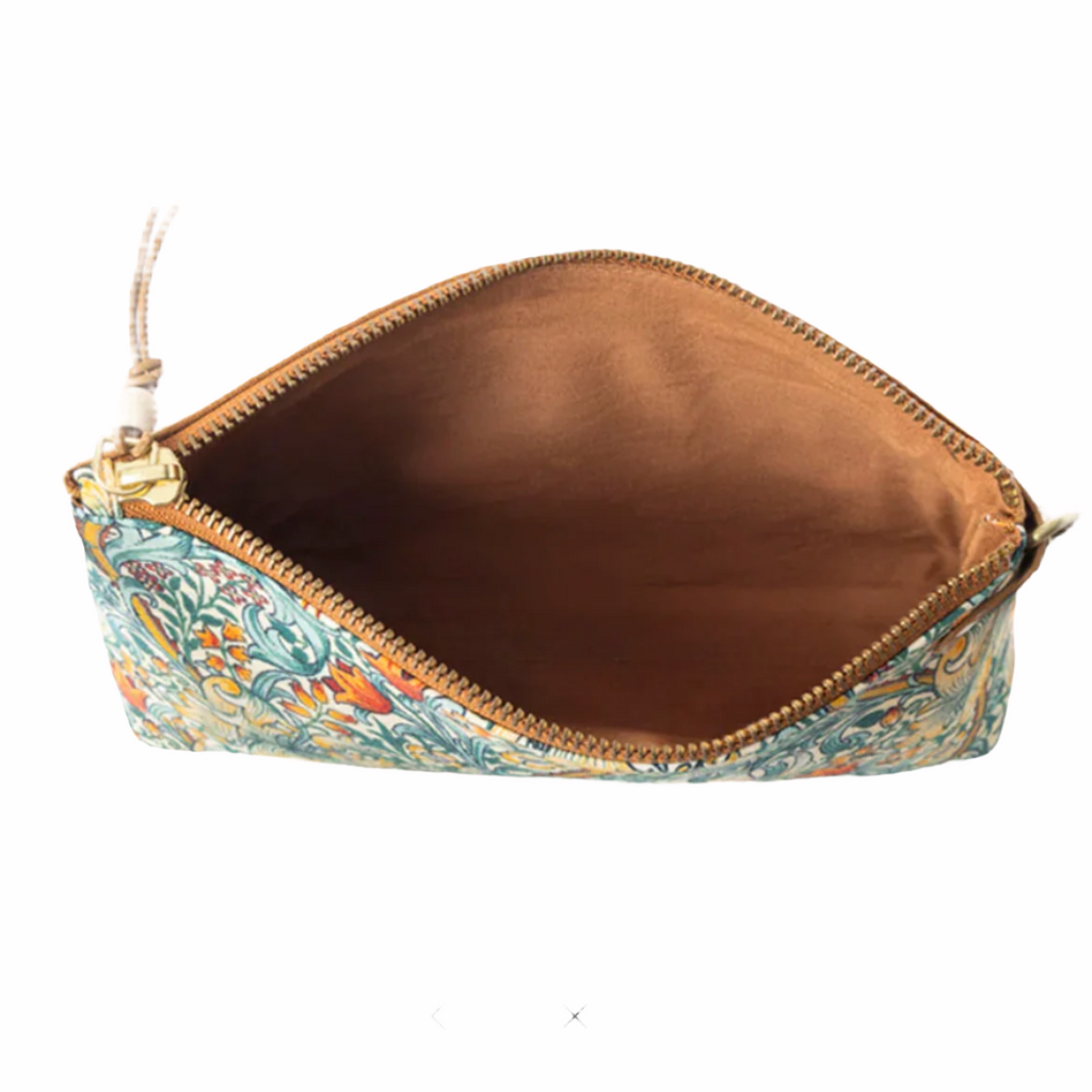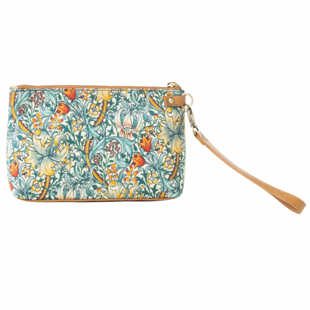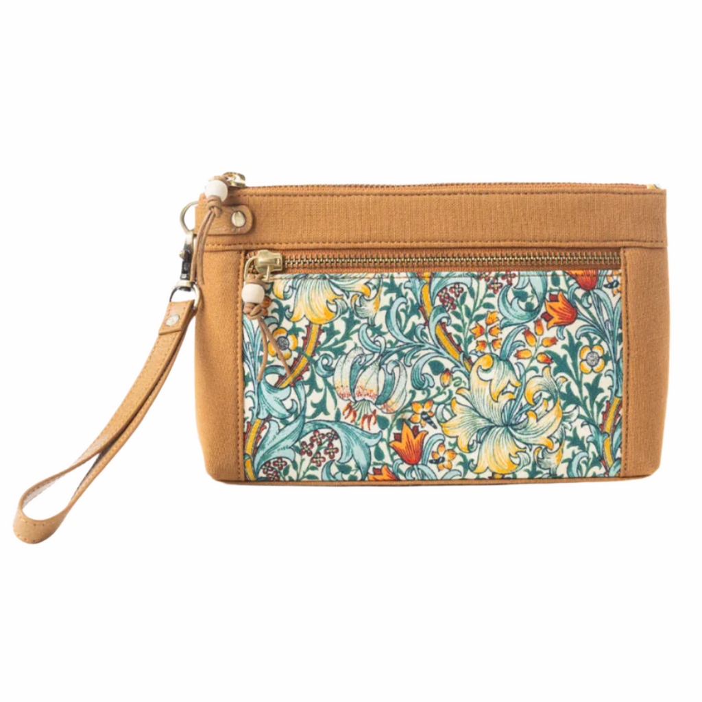 Artfully blend vintage charm with modern sustainability in this William Morris-inspired clutch. Featuring upcycled canvas trim and enchanting botanical prints in sage, golden yellow, and coral. Multiple pockets keep essentials organized while brass hardware adds a refined touch to this eco-conscious accessory. Zipper-close top. Wristlet carrying strap is in matching leather.