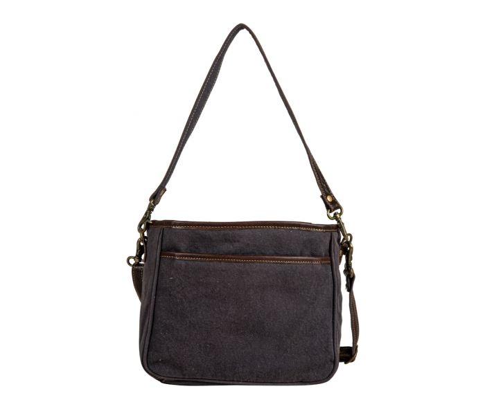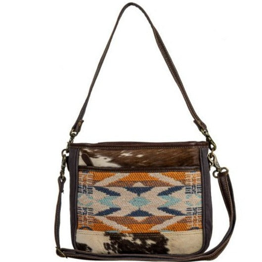 With a front accent of hair-on hide, this great bag makes a wonderful fashion statement. The upcycled woven rug features hues of rust, orange, blues and ivory in a tribal-inspired pattern. The spacious interior features a zipper close top, and the carrying strap and adjustable, removable shoulder strap are also in matching leather. Back is charcoal woven canvas with separate side compartment for convenience