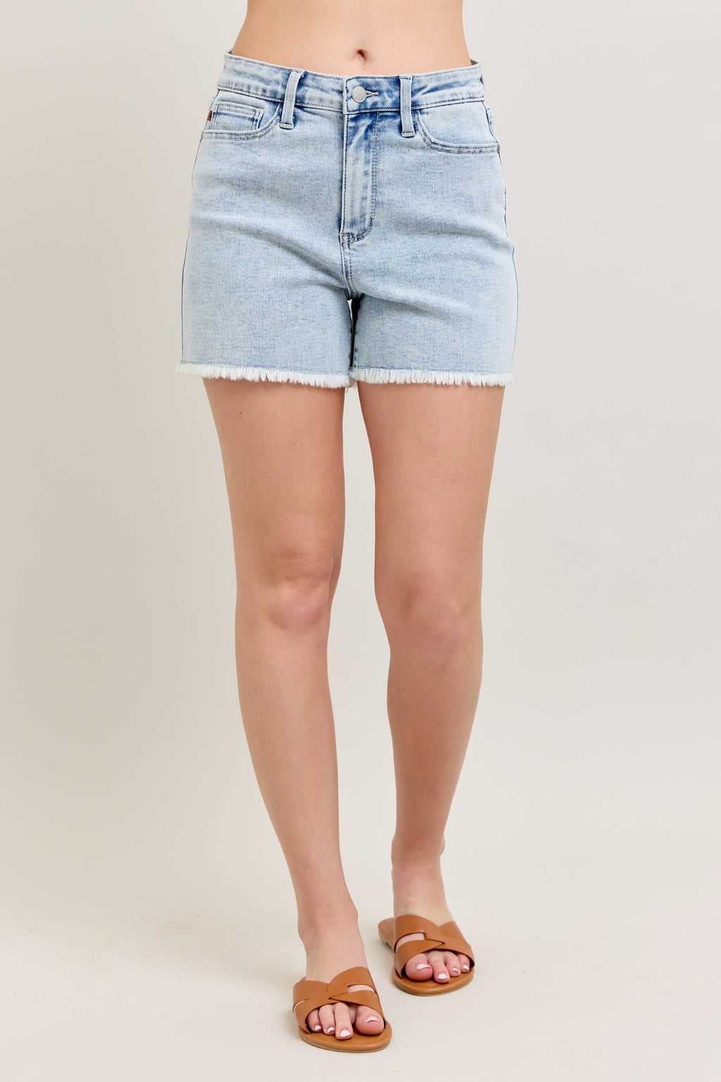 These high-waisted cut-off shorts blend comfort and style with a soft mineral wash finish. Crafted from 76.2% cotton, 22.5% polyester, and 1.3% spandex, they offer just the right stretch for your playful adventures.