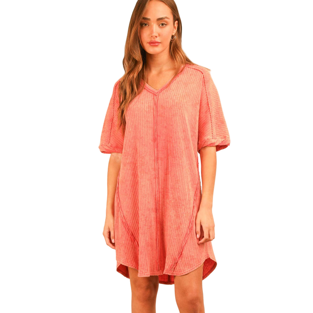 Mineral Washed Ribbed Knit Shift Mini Dress - V-Neck - Oversized - Drop Shoulder - Short Sleeve - Round Hi-lo Hem (Model height: 5"8", wearing a Small)