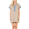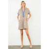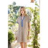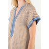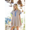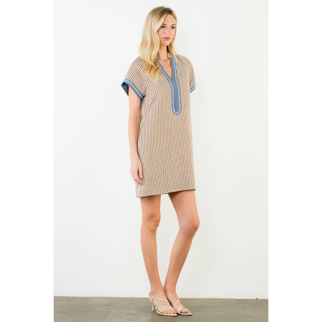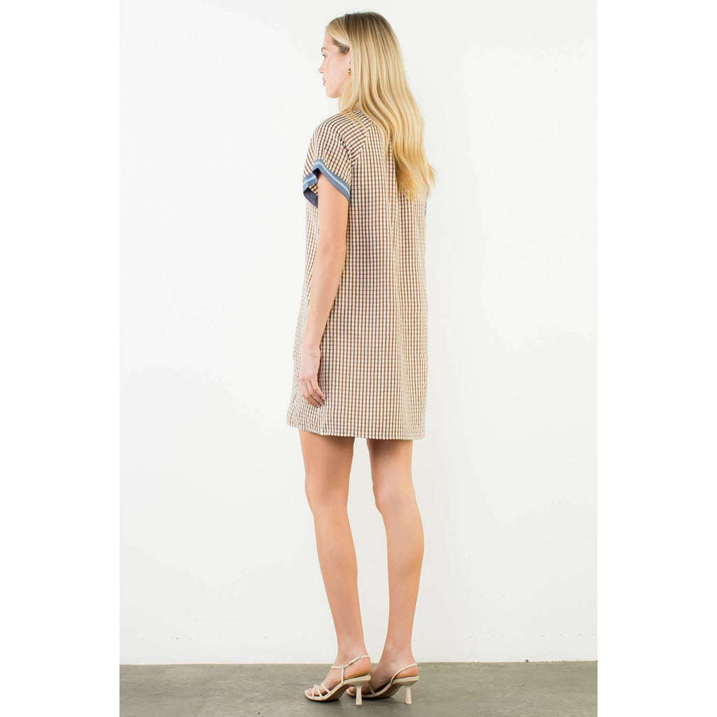 Adorable brown gingham meets cheerful blue trim in this short-sleeved dress that's ready for any occasion. The classic checkered pattern brings timeless charm with a modern twist, while the crisp blue accents add just the right pop of color. Perfect for casual outings or dressed up for something special.