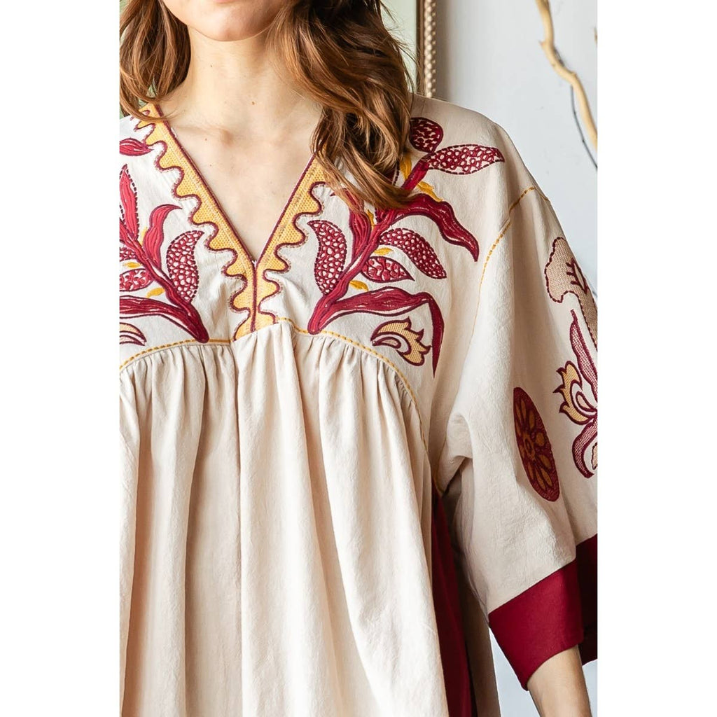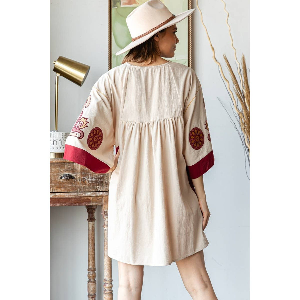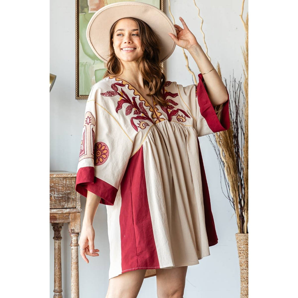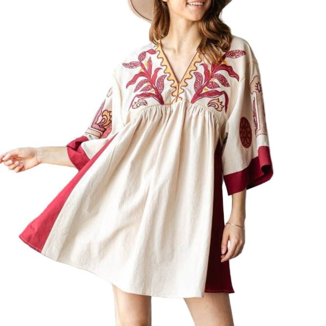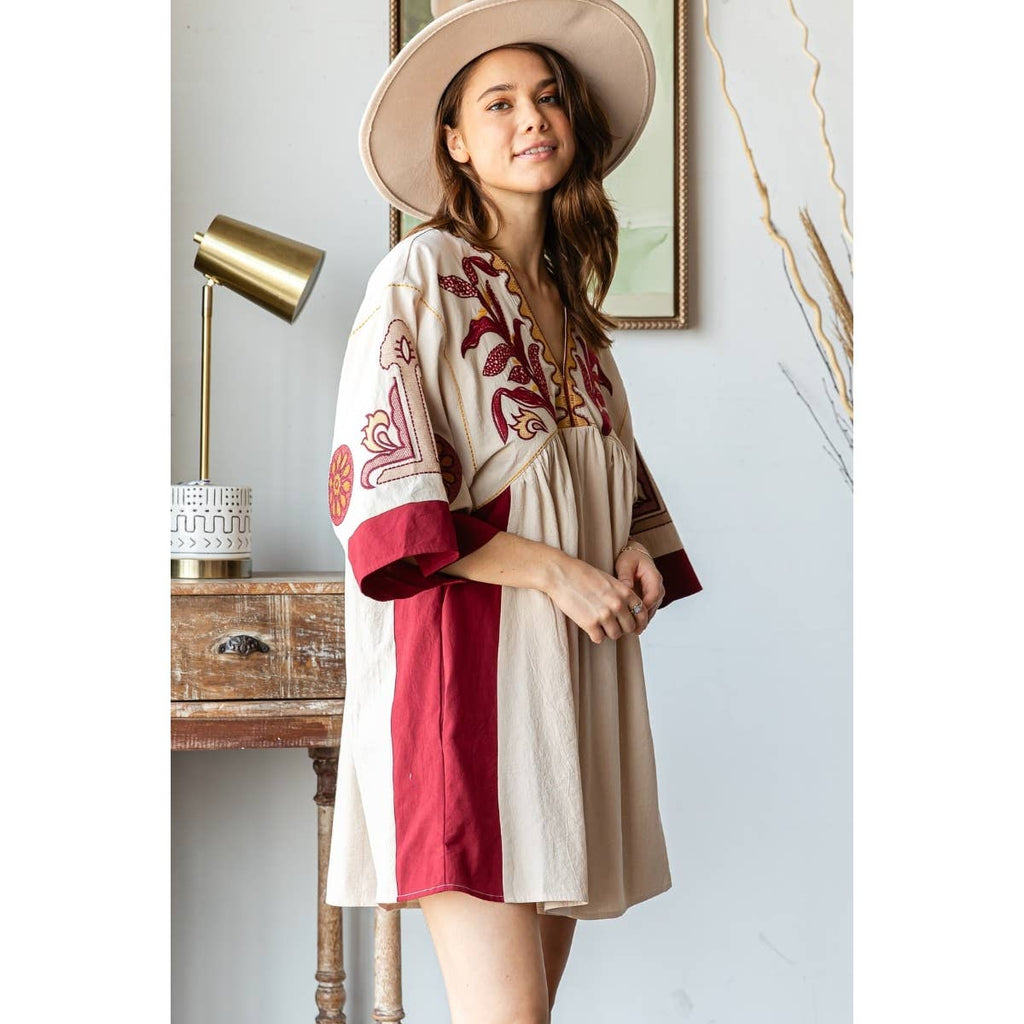 Featuring a V-neckline and vintage embroidery patch, this dress boasts a unique and playful style. The relaxed A-line fit, solid contrast on sleeve end and side, and short length add to its charm. Handmade with love, this dress is crafted from 85% Rayon and 15% Linen. Don't forget to handwash it cold! (Model is 5'8" and wearing size Small).