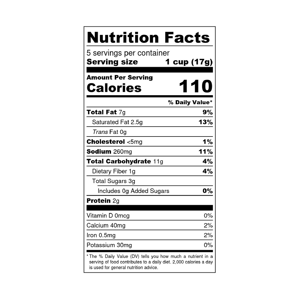 Ingredients: Non-GMO Popcorn, Cheddar Cheese Powder, Sunflower Oil, Coconut Oil, Jalapeño Powder, Celtic Sea Salt®