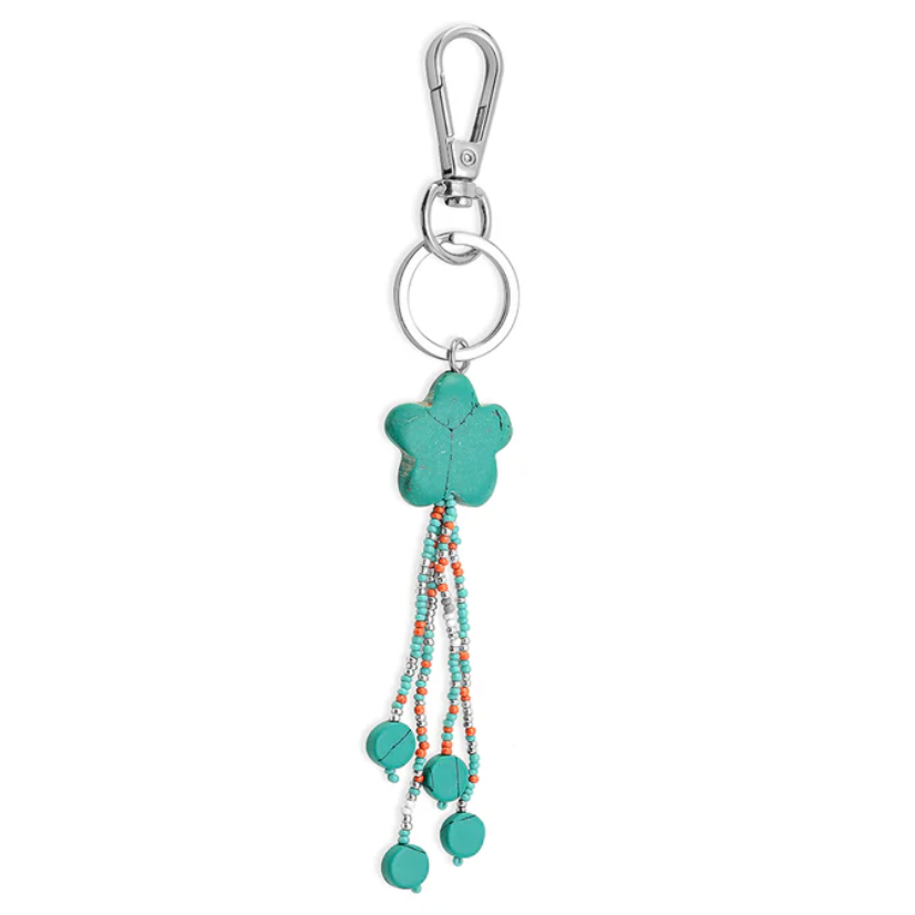 Brighten your keyring with this delicate fob featuring a turquoise star streaming with strands of coral and silver beads. Like a star shooting across the desert night, each beaded strand creates flowing Southwest magic.
