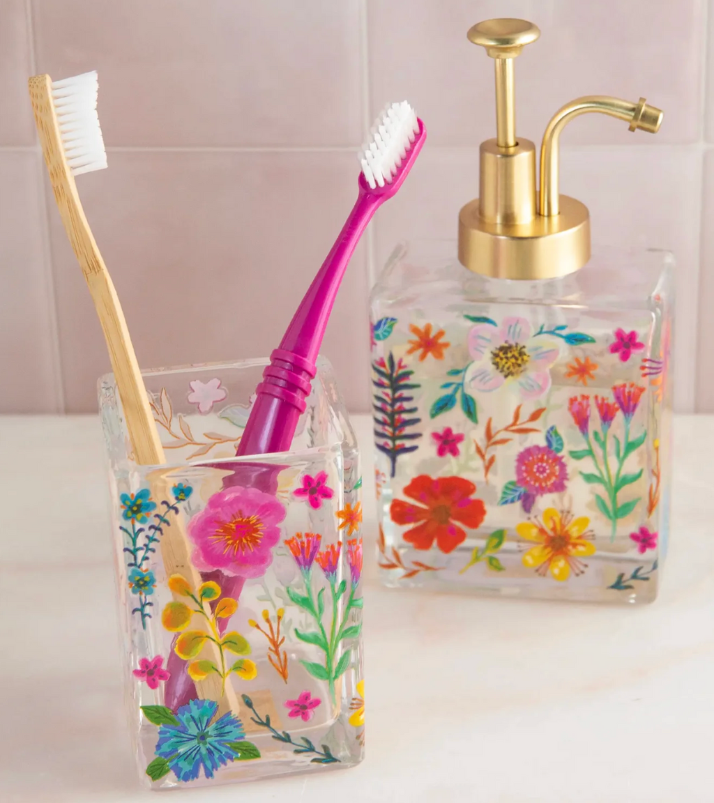 It's the perfect glass tumbler to hold your bathroom essentials. The beautiful floral design and unique hand painted look will bring a smile to your face every morning!