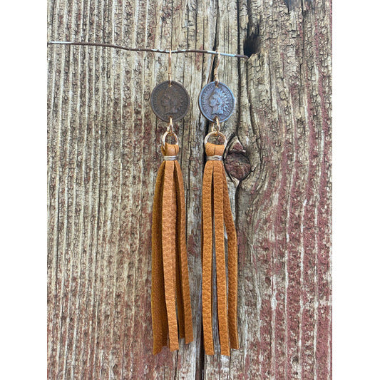 Authentic Buffalo Nickels with Leather Tassel Earrings. Solid Bronze Ear Wires.