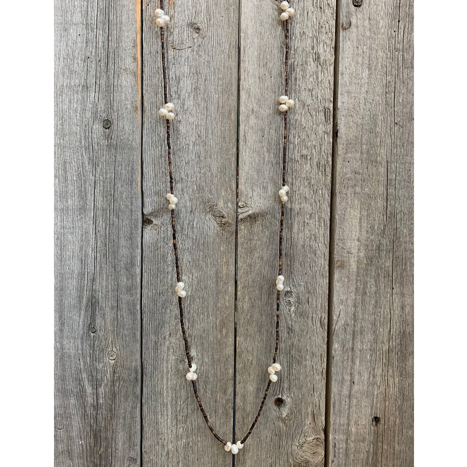 48" White Teardrop Freshwater Pearls and Brown Pin Shell Wrap Necklace.