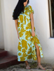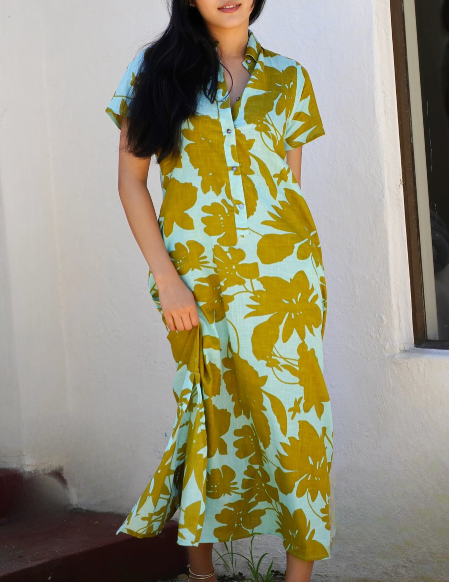 The Carrie Dress in Turquoise & Olive is a breathable and lightweight pullover dress in an abstract leaf print. Wear this relaxed fit dress for a casual day out or dress it up w/ strappy heels. Perfect to throw over and go, the effortless Carrie Dress is midi length dress and has side pockets.