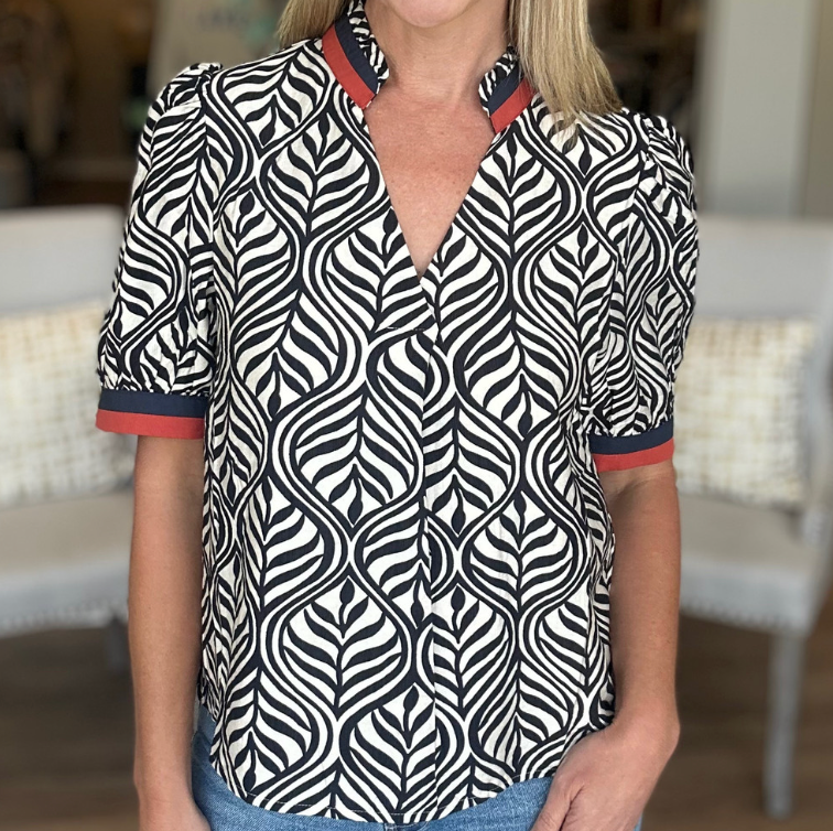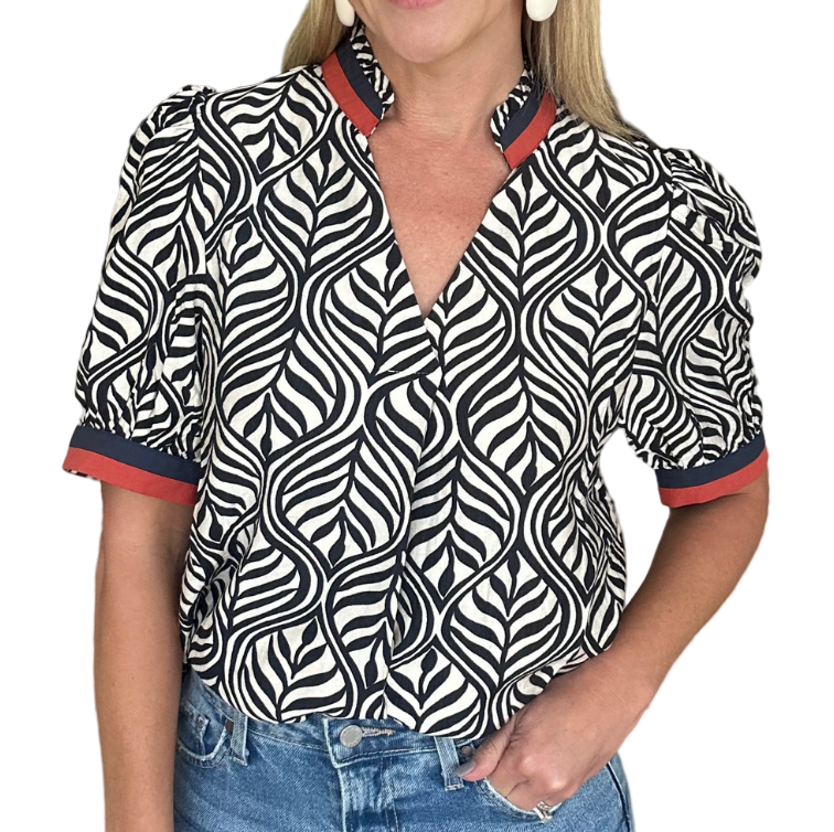 This playful short sleeve top features a bold black and white design accented with a fun rust-colored trim for a fresh, eye-catching look.