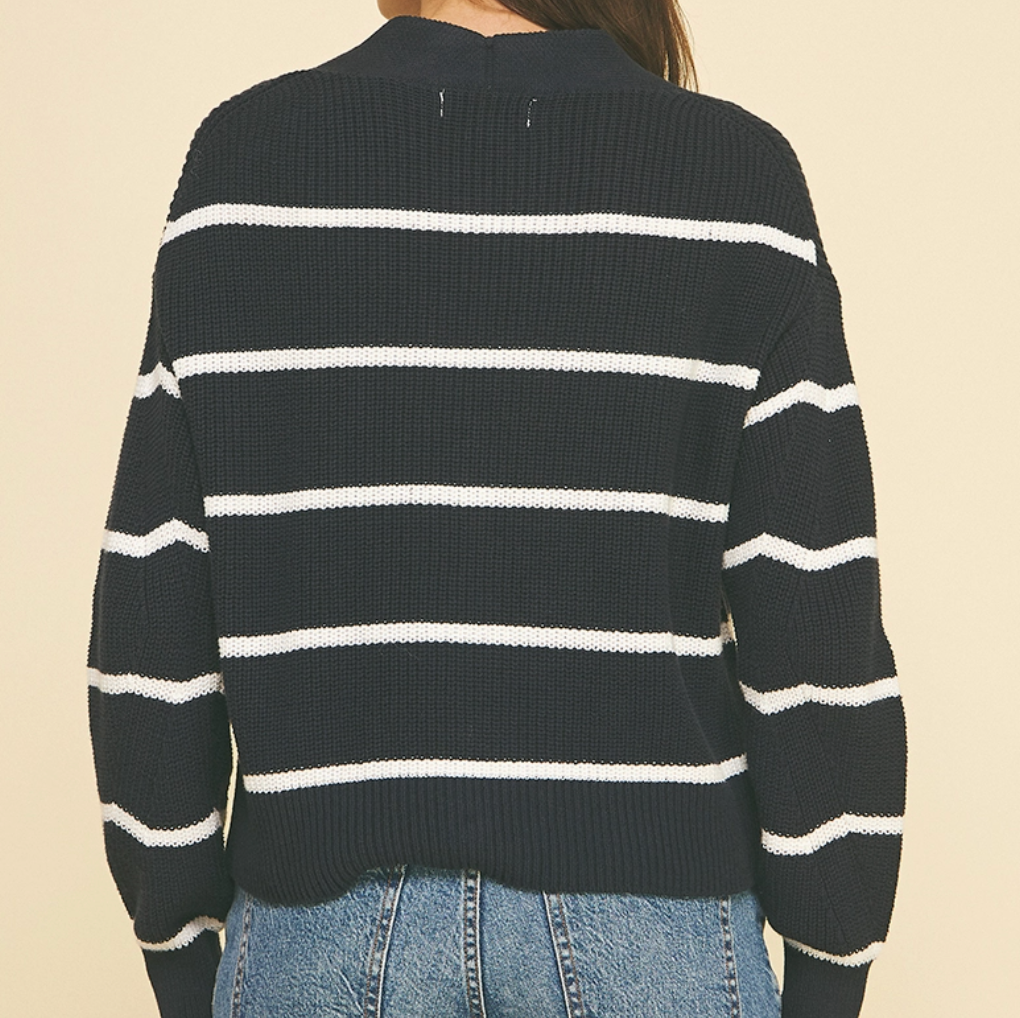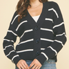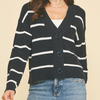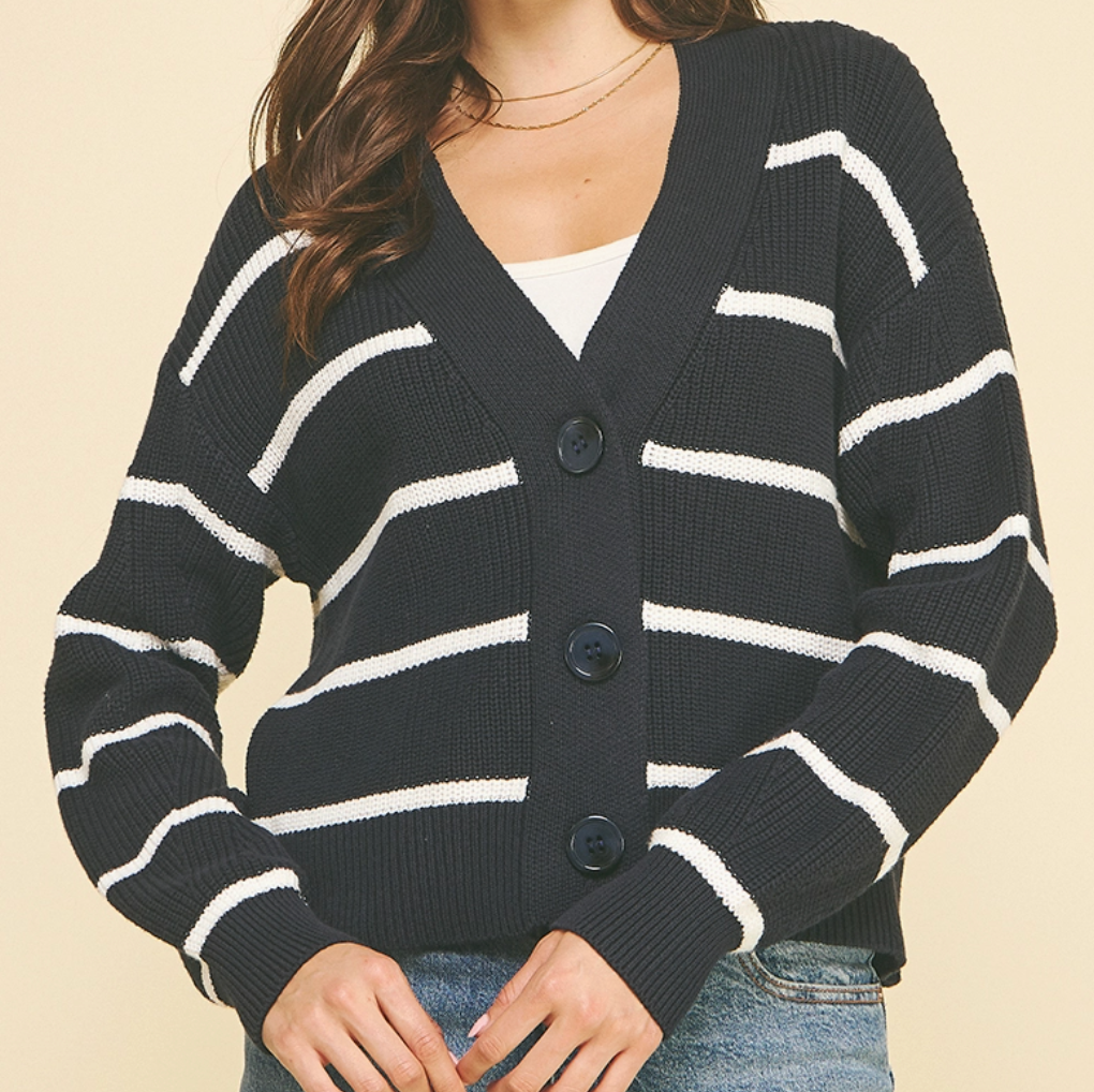 Slip into effortless style with this charming navy cardigan. Featuring a flattering V-neck, convenient button-down front, and relaxed drop shoulders, it's the perfect layering piece for any season. Long sleeves keep you cozy while the striped knit adds visual interest to your everyday wardrobe. 100% cotton