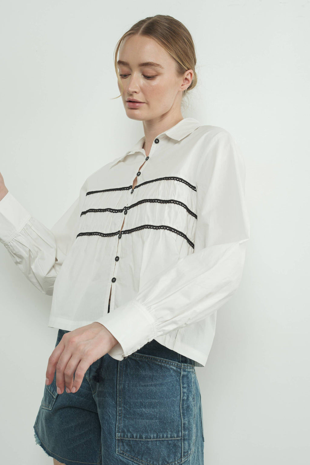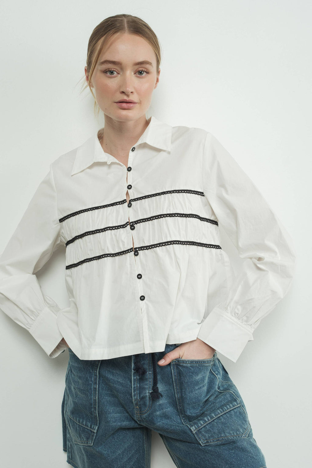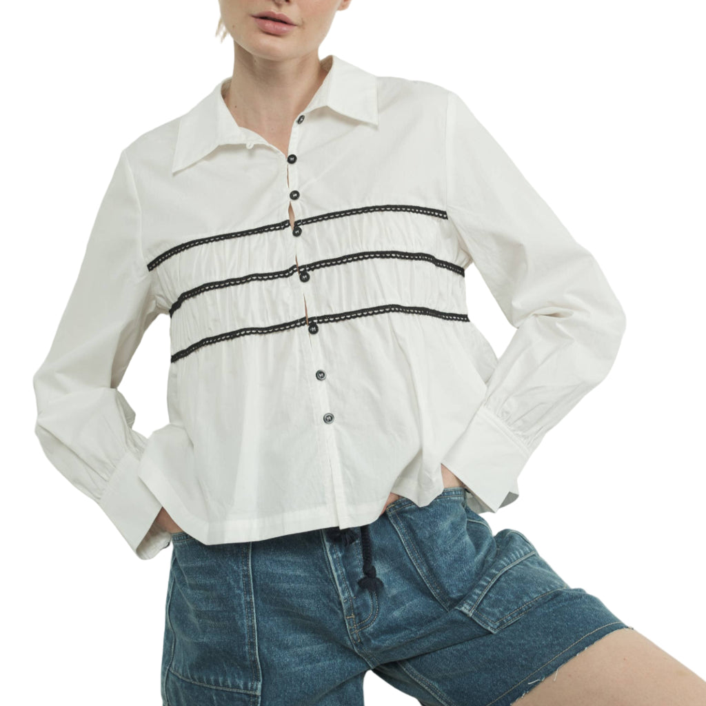 This babydoll shirts is featured in a classic cotton fabrication and slightly cropped fit with gathered detail and contrast lace trim. Boxy fit, Cotton fabrication, collared-neckline, button-front closures, contrast lace trim, gathered detail for added dimension, long-sleeves with cuffs