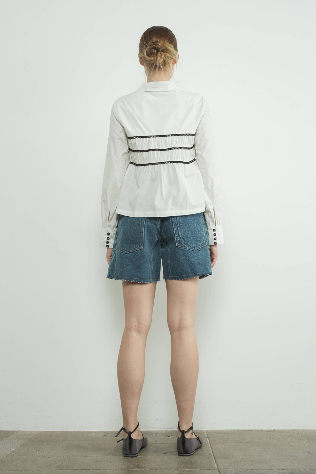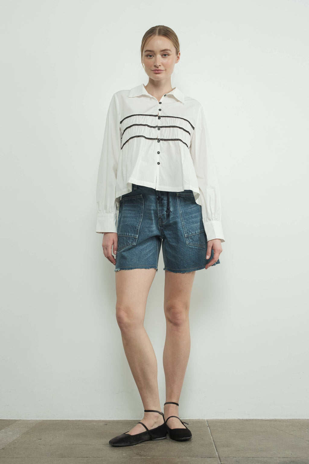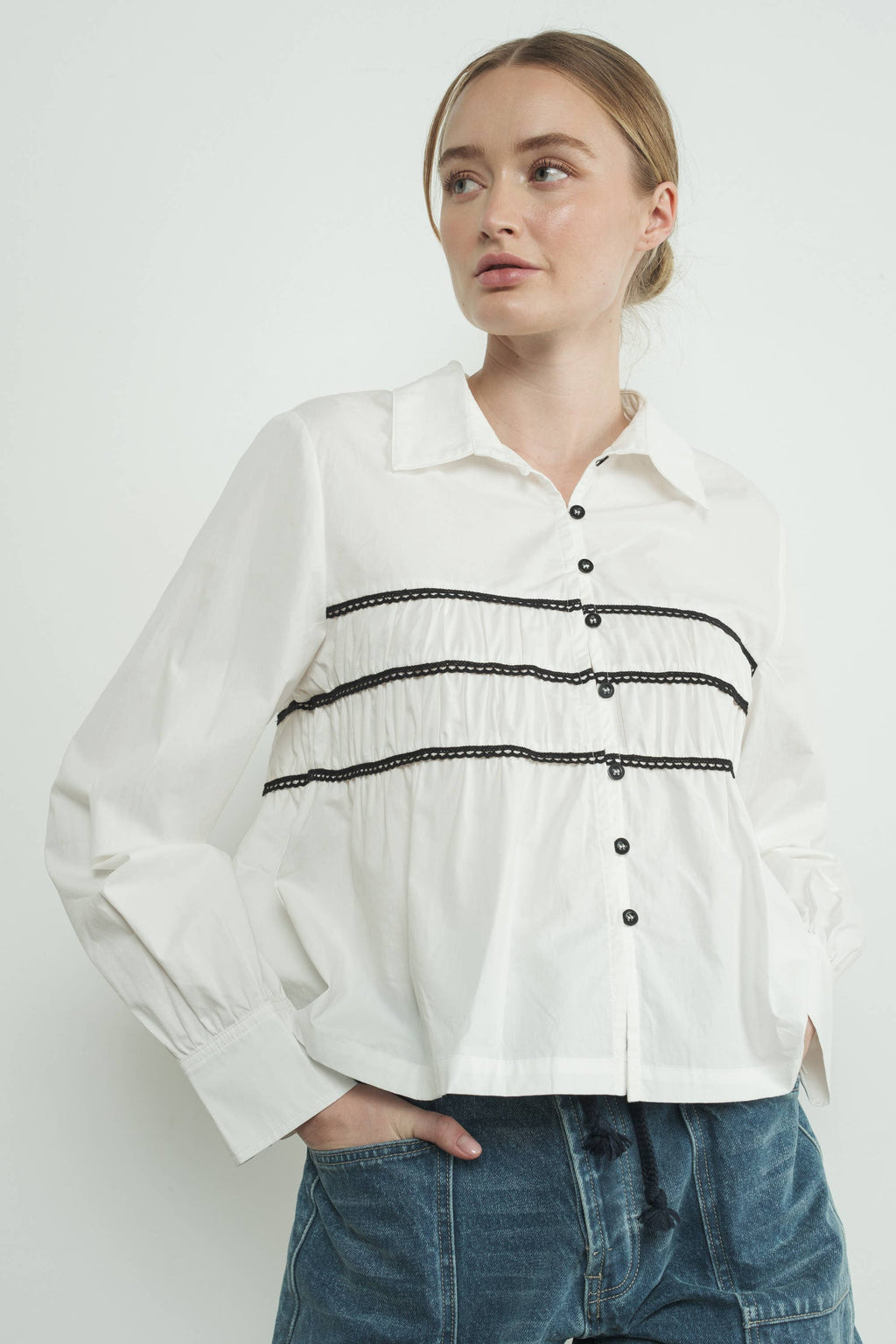 This babydoll shirts is featured in a classic cotton fabrication and slightly cropped fit with gathered detail and contrast lace trim. Boxy fit, Cotton fabrication, collared-neckline, button-front closures, contrast lace trim, gathered detail for added dimension, long-sleeves with cuffs