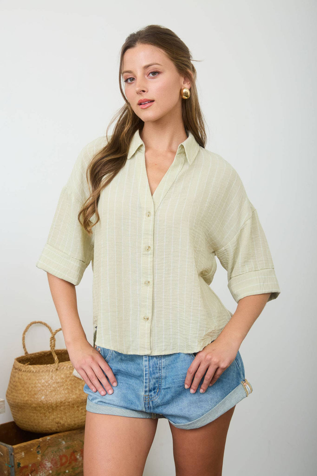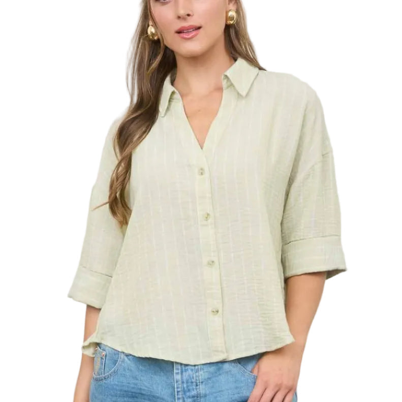 Elevate your wardrobe with this charming pinstriped button-down that's anything but ordinary. The relaxed drop sleeves and roomy fit make it perfect for layering or going solo, while the playful 3/4 length keeps things fresh and modern. Finished with a chic U-hem and crafted from smooth 100% polyester, this woven beauty transitions effortlessly from casual to polished.