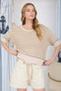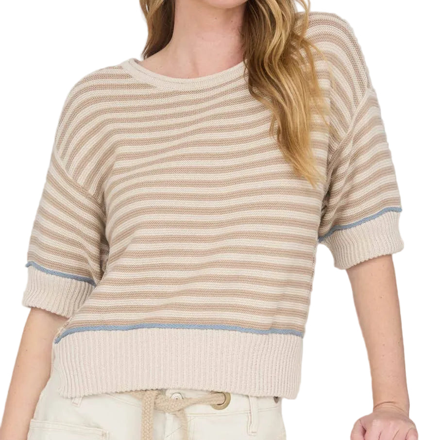 Cozy up in effortless style with this striped knit pullover that's got personality for days. The raw edge neckline and contrast trim add just the right amount of edge, while drop shoulders and a ribbed hem keep things relaxed and comfortable. Short sleeves make it perfect for layering or going solo. Not lined, so it's breathable and ready for whatever your day throws at you.