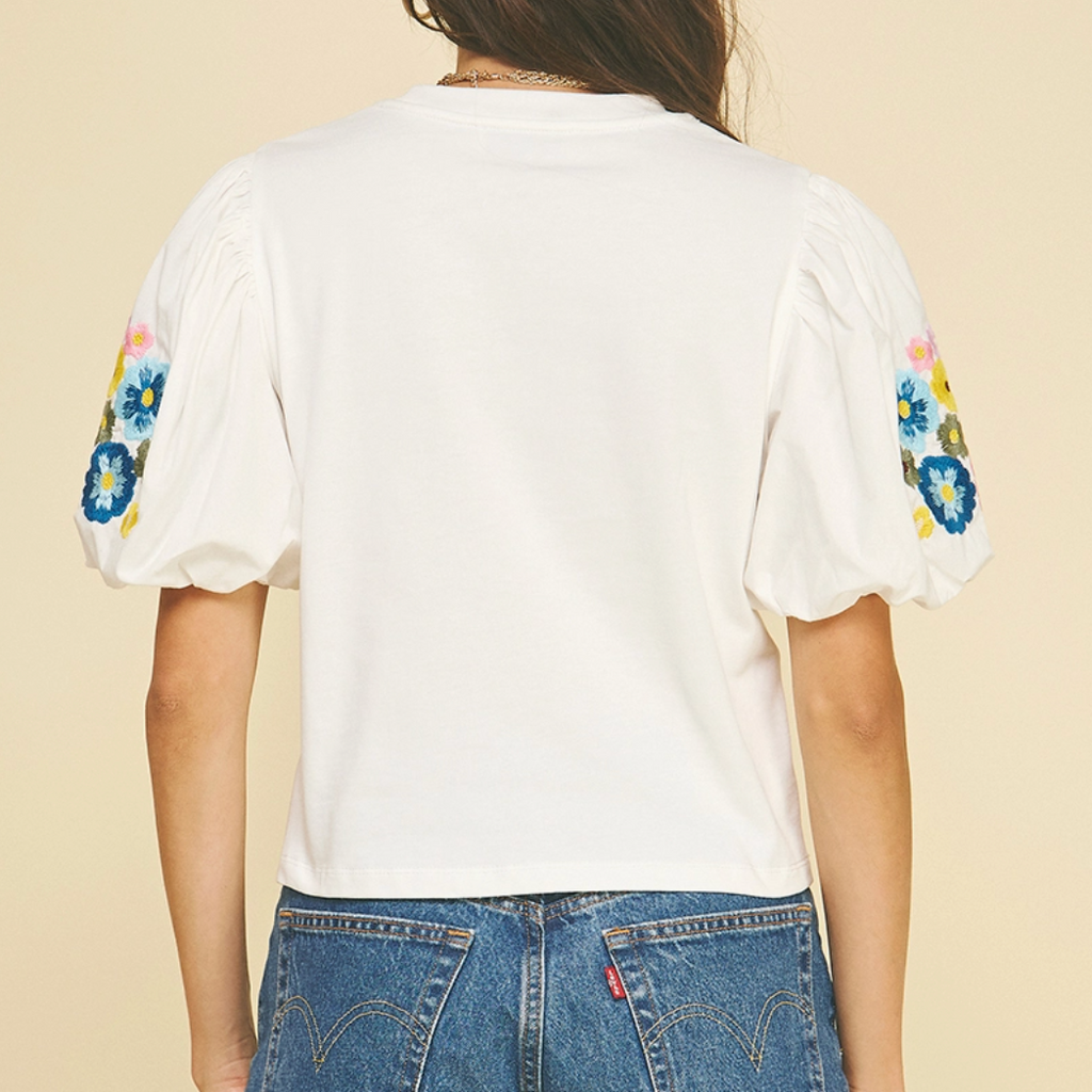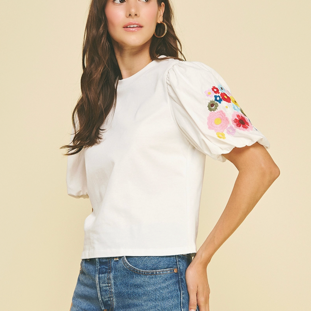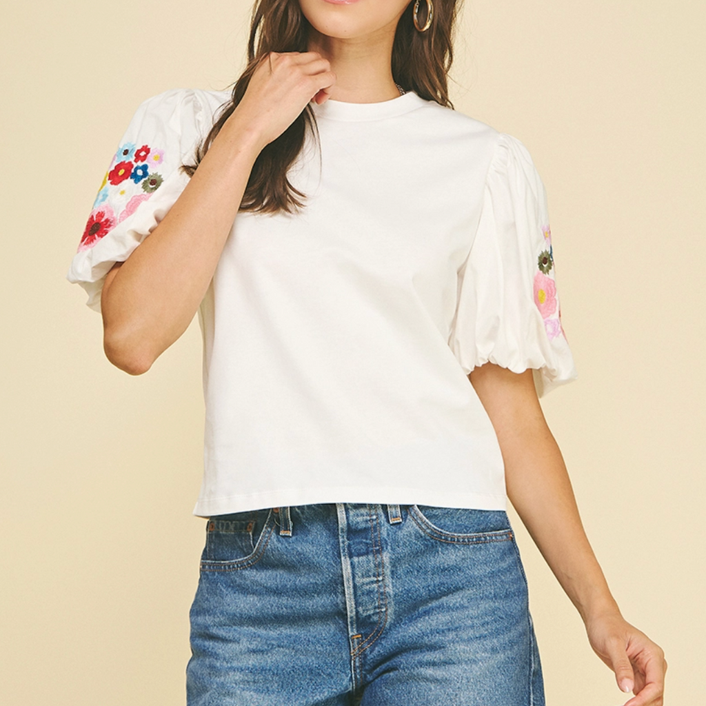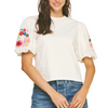 Playful top that blends cozy knit with crisp woven fabric, featuring a charming round neckline and voluminous bubble sleeves adorned with delicate floral embroidery. The perfect mix of textures and details for effortless style.