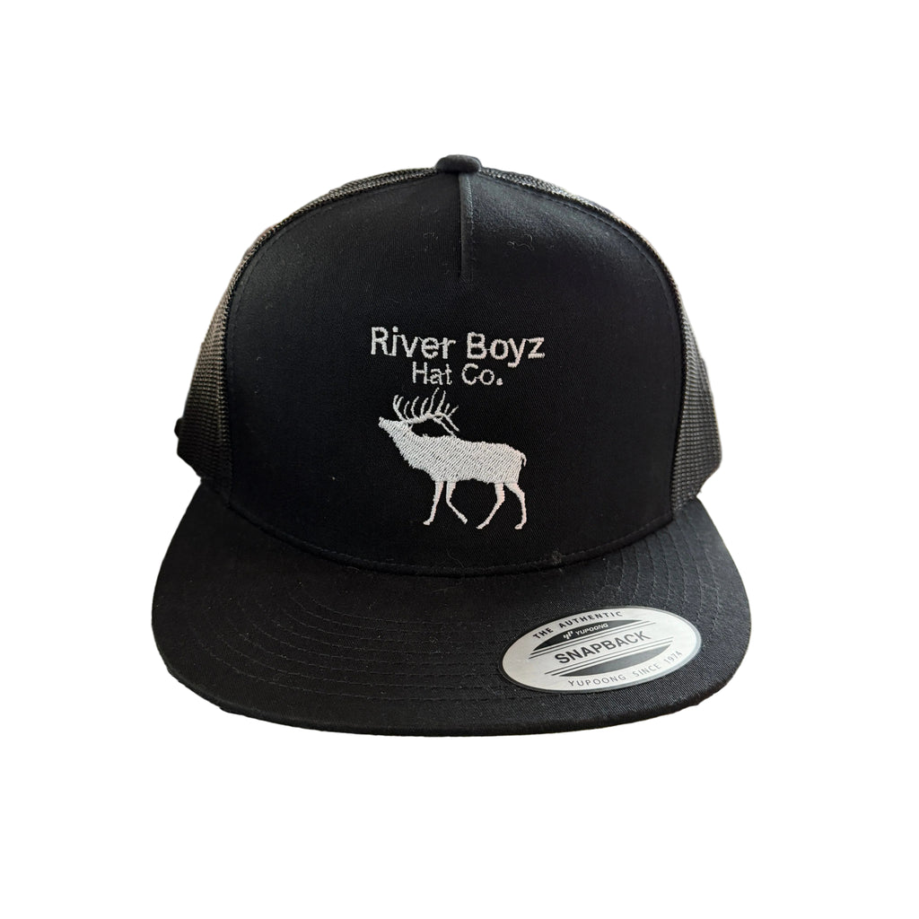 River Boyz Hat Co brings authentic local craftsmanship to your everyday style. This black mesh-back cap features crisp white embroidery of an elk logo, perfect for outdoor enthusiasts and those who appreciate regionally made goods. The breathable mesh construction keeps you cool during warm weather, while the structured front panels provide classic trucker-style comfort. Ideal for fishing trips, casual outings, or showing support for local makers. Made by River Boyz Hat Co with attention to detail and quality materials.