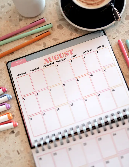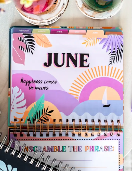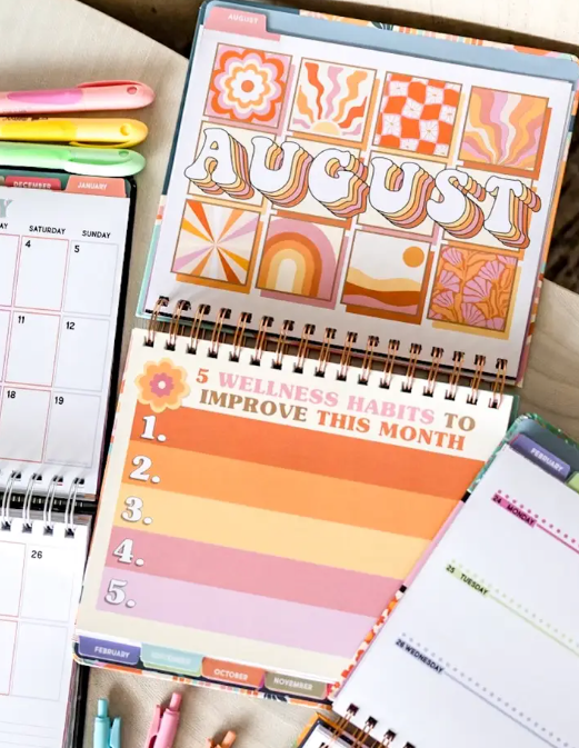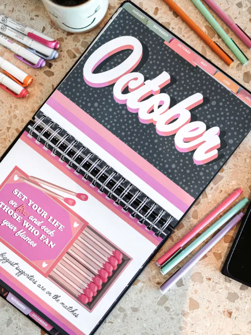 the planner flips VERTICALLY so you will not run out of arm space when filling in an interactive page, full month calendar and weekly breakdowns for each month