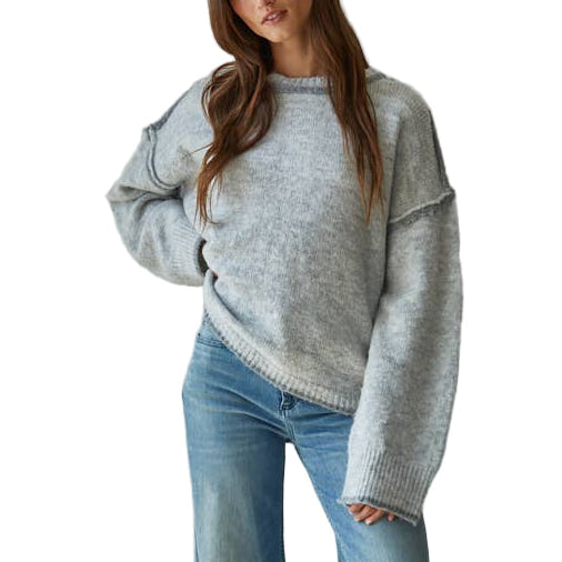 Knit Sweater Crew Neck Pullover Top With Rolled Edge