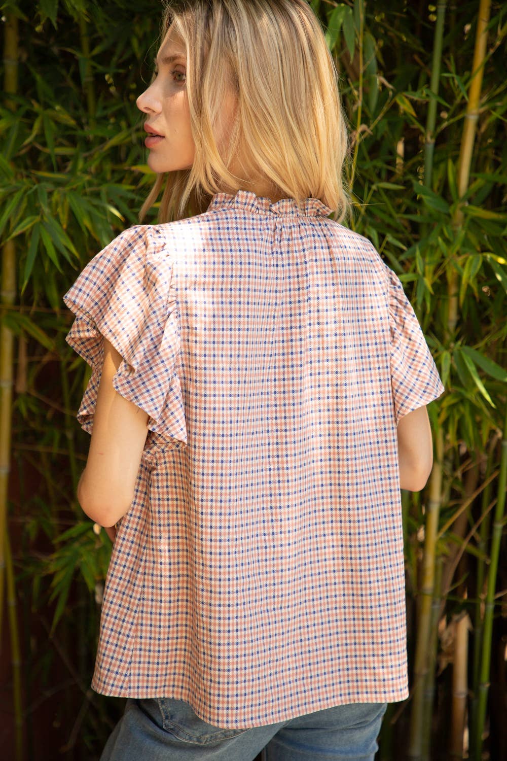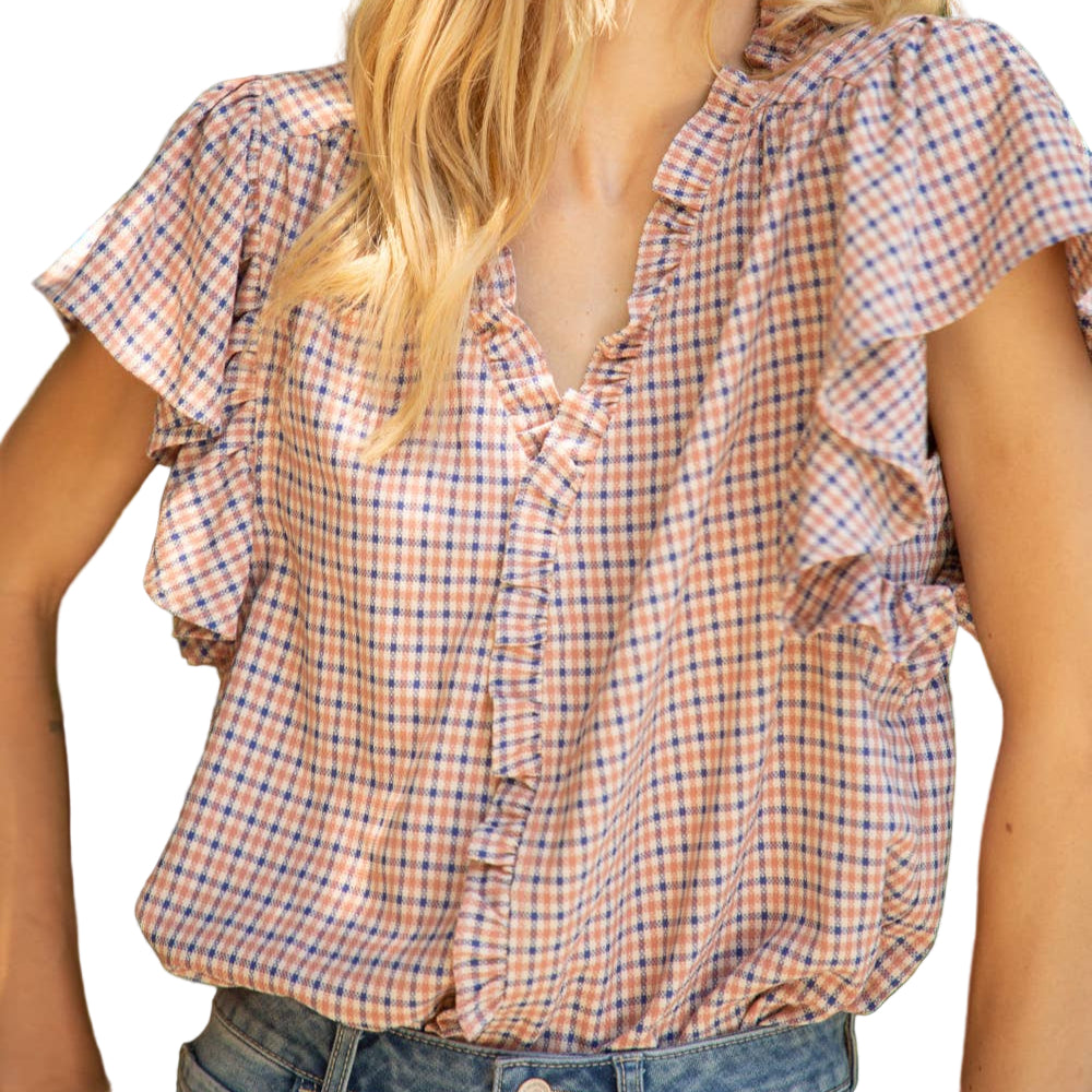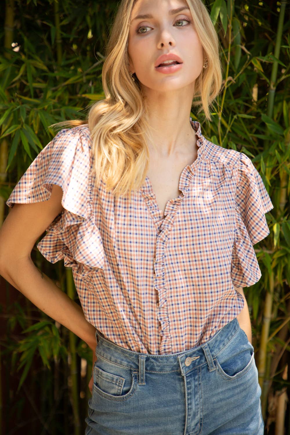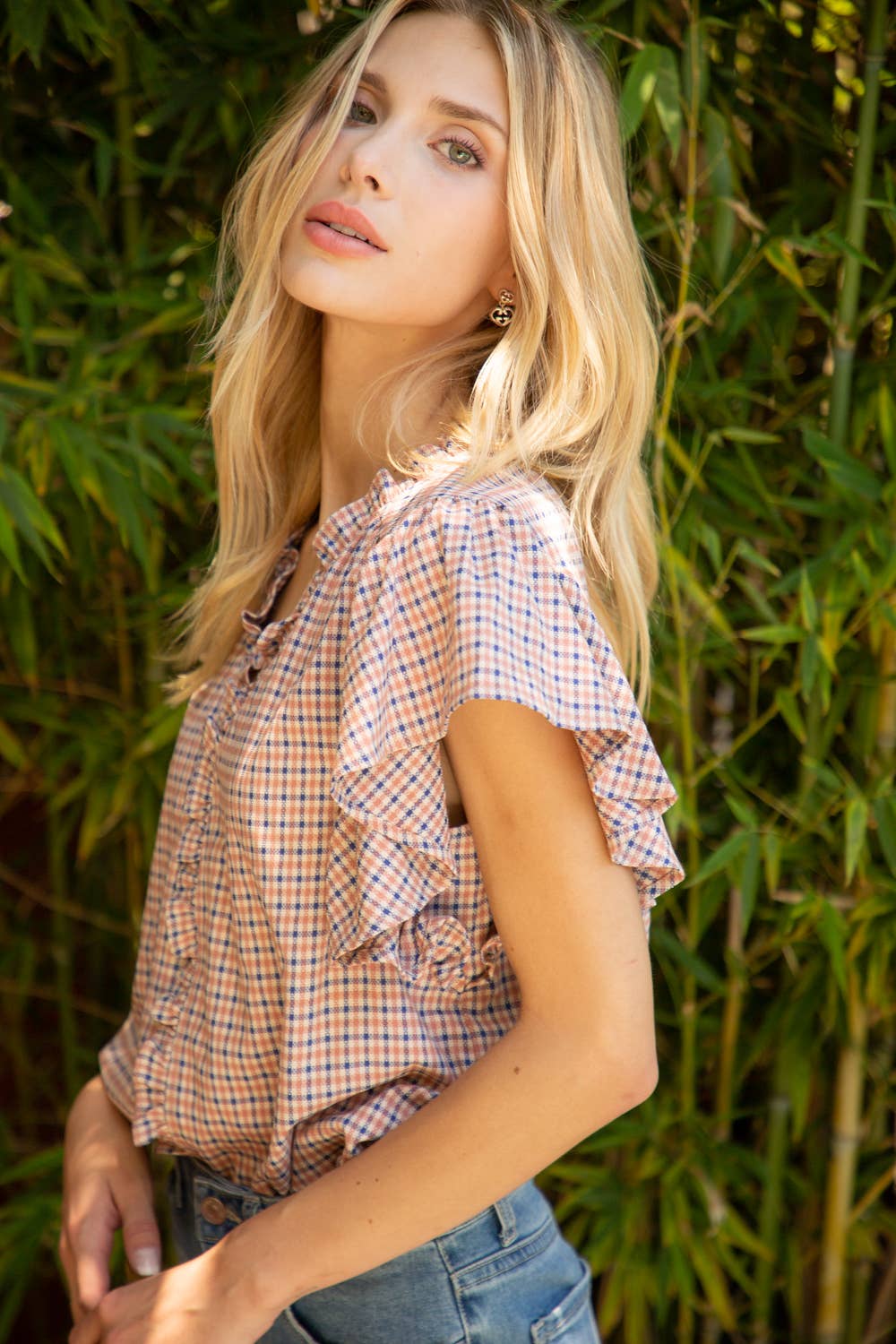 - Ruffle details on the neck line and sleeves - Open front with shell buttons and button loops - Plaid woven fabric Size Information: Model height 5' 8", wearing size Small