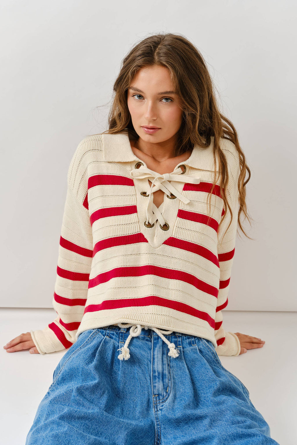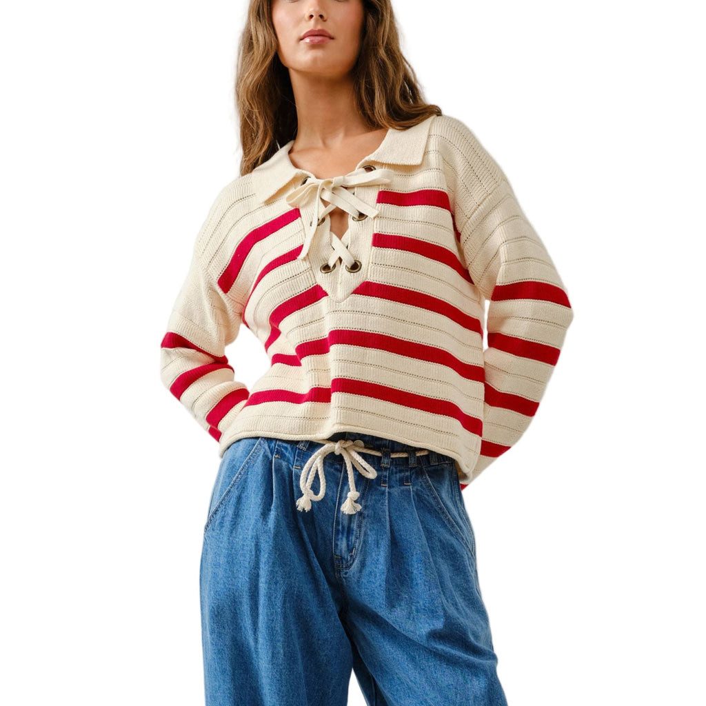 Lace Up Striped Sweater