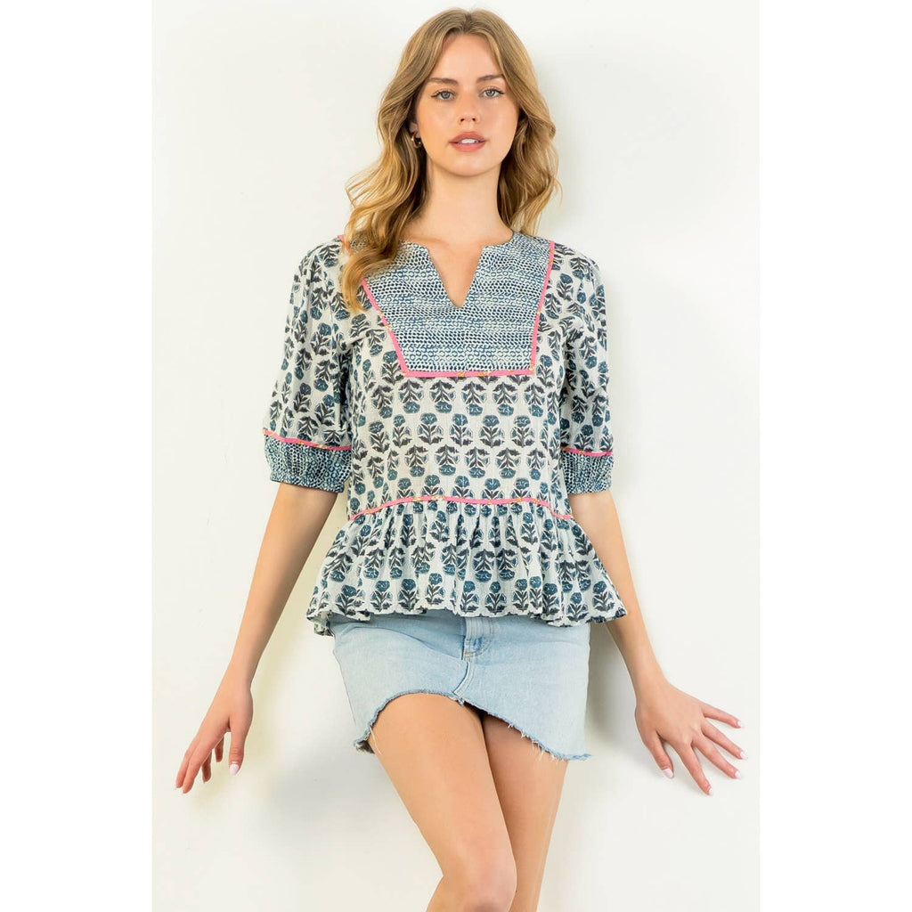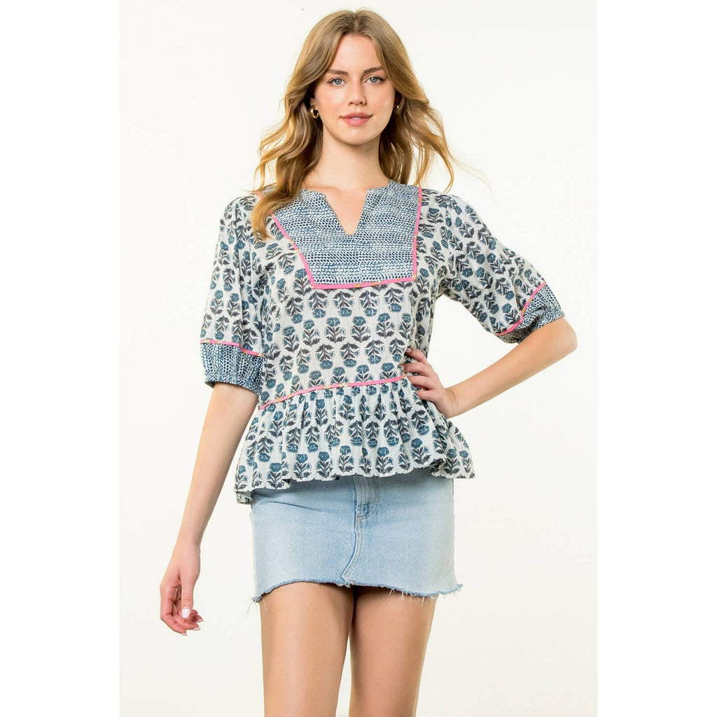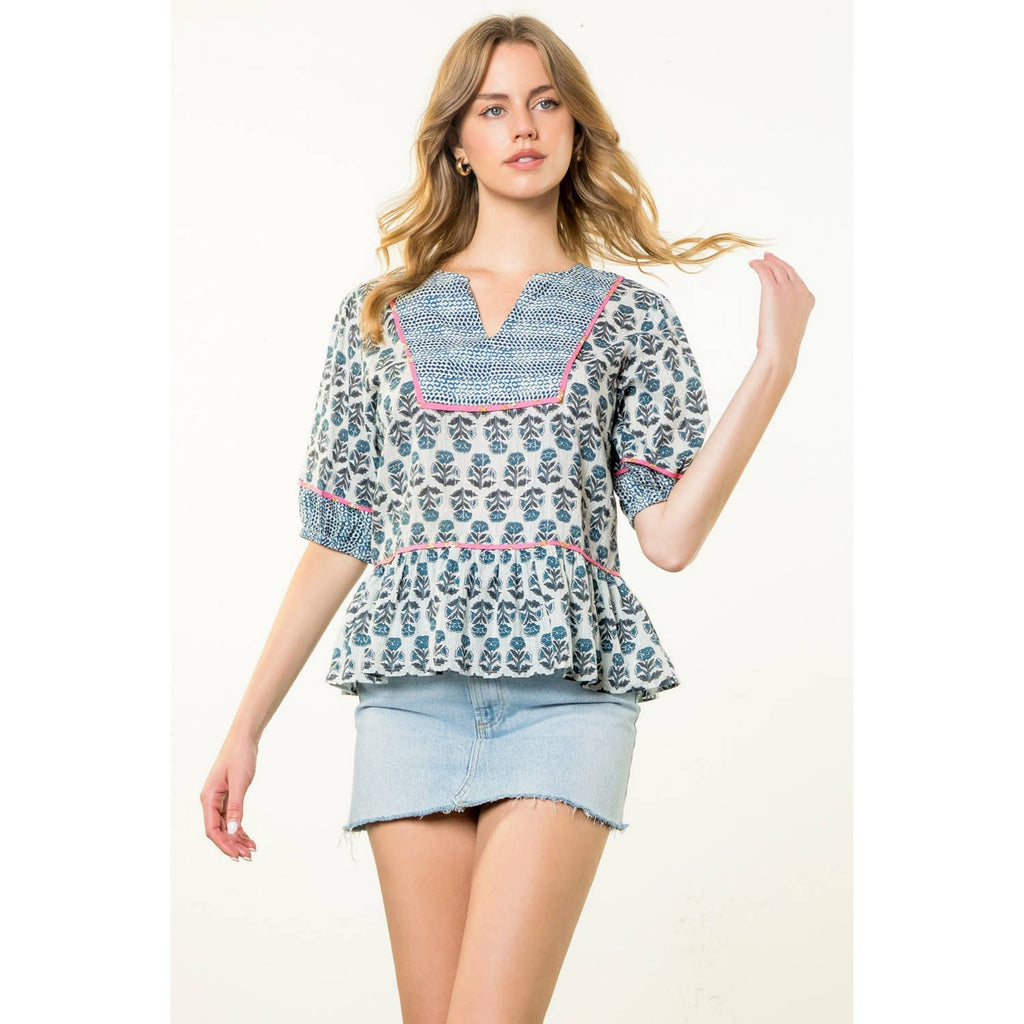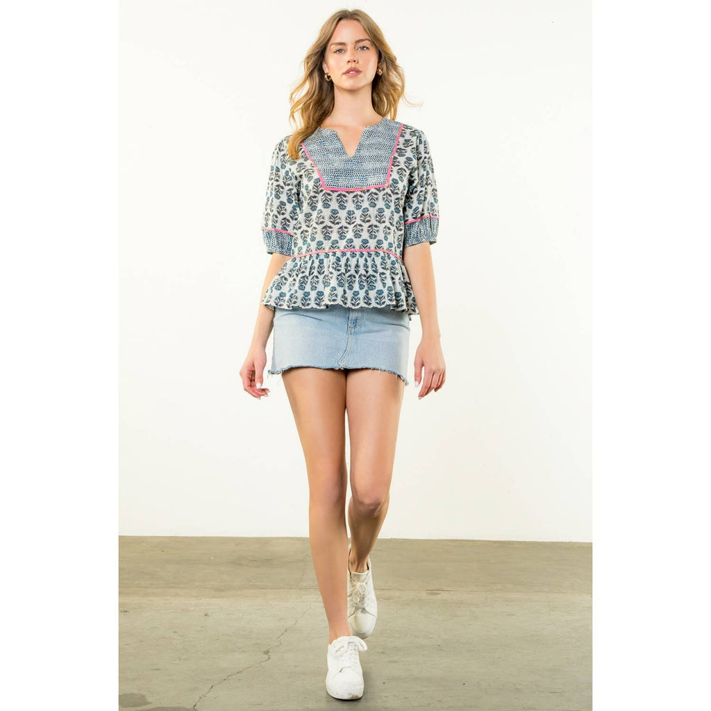 Puff Sleeve Flower Print Top. / Style Measurements for Size S / Designed in USA - Body Length: 23 1/2 in - Bust Width: 38 in - Sleeve Length: 12 3/4 in. / Model Sizes - Wearing Size S - Height 5' 9", Bust 32", Waist 25 1/2", Hips 36". / Prepack Contents - In a Pack of XS(1), S(2), M(2), and L(1) per Color Only. / Fabric Content - WOVEN / 100% Cotton