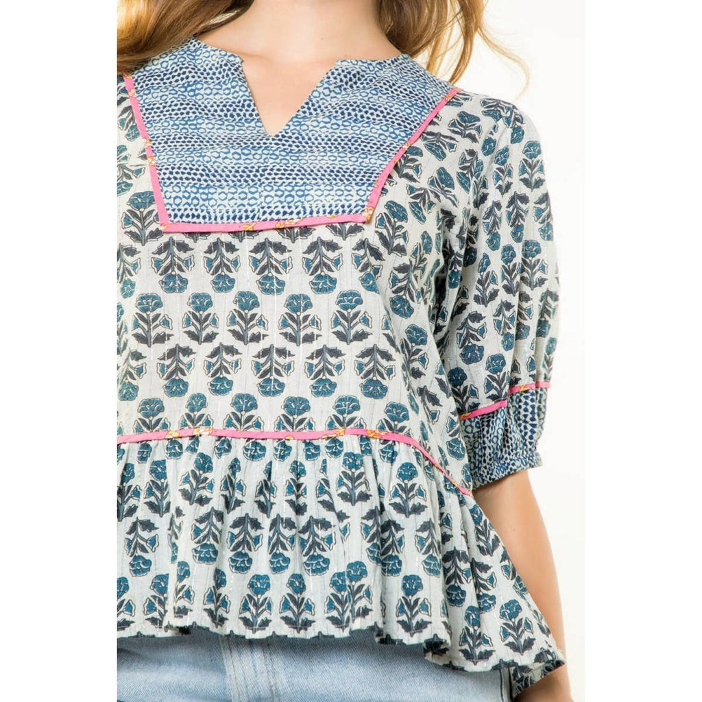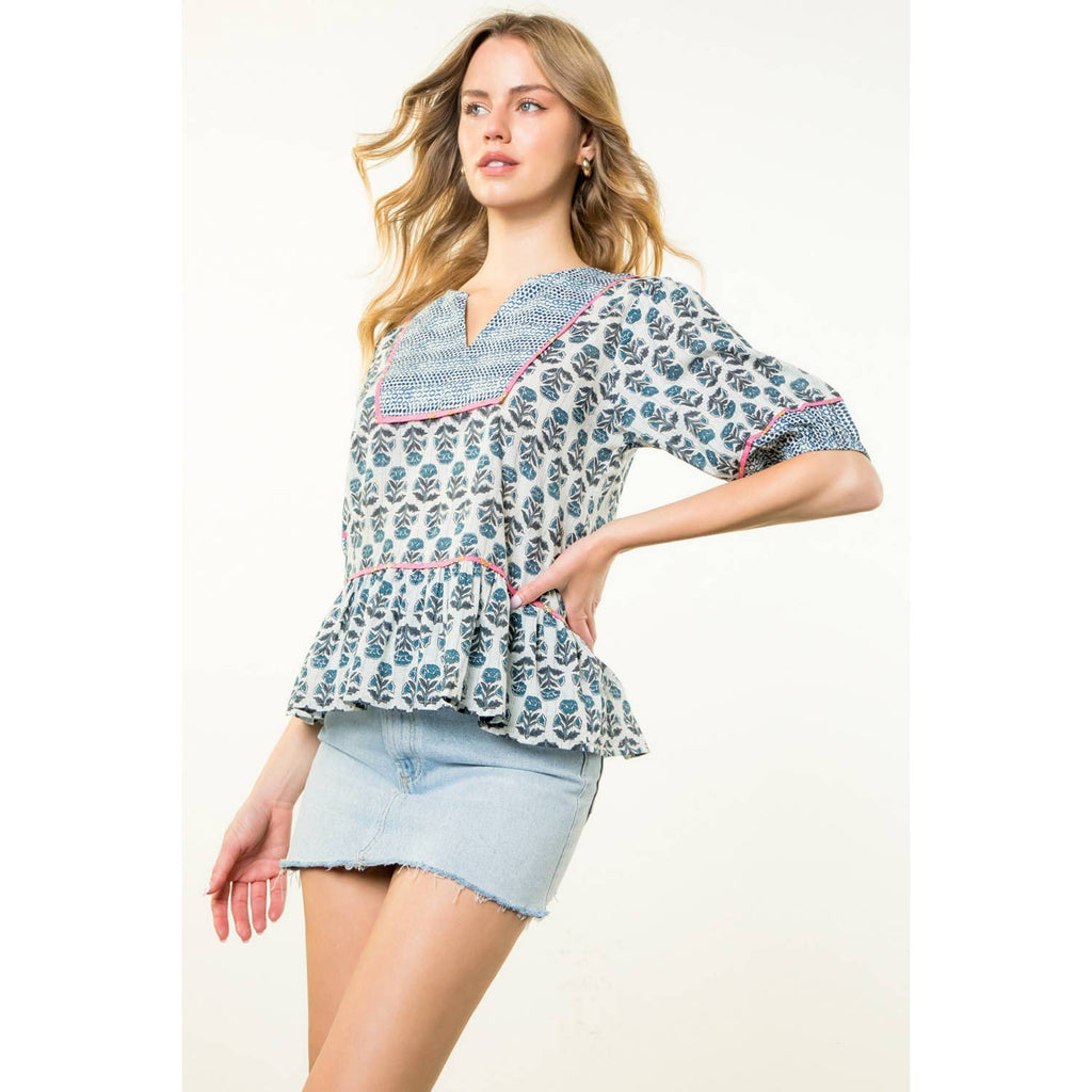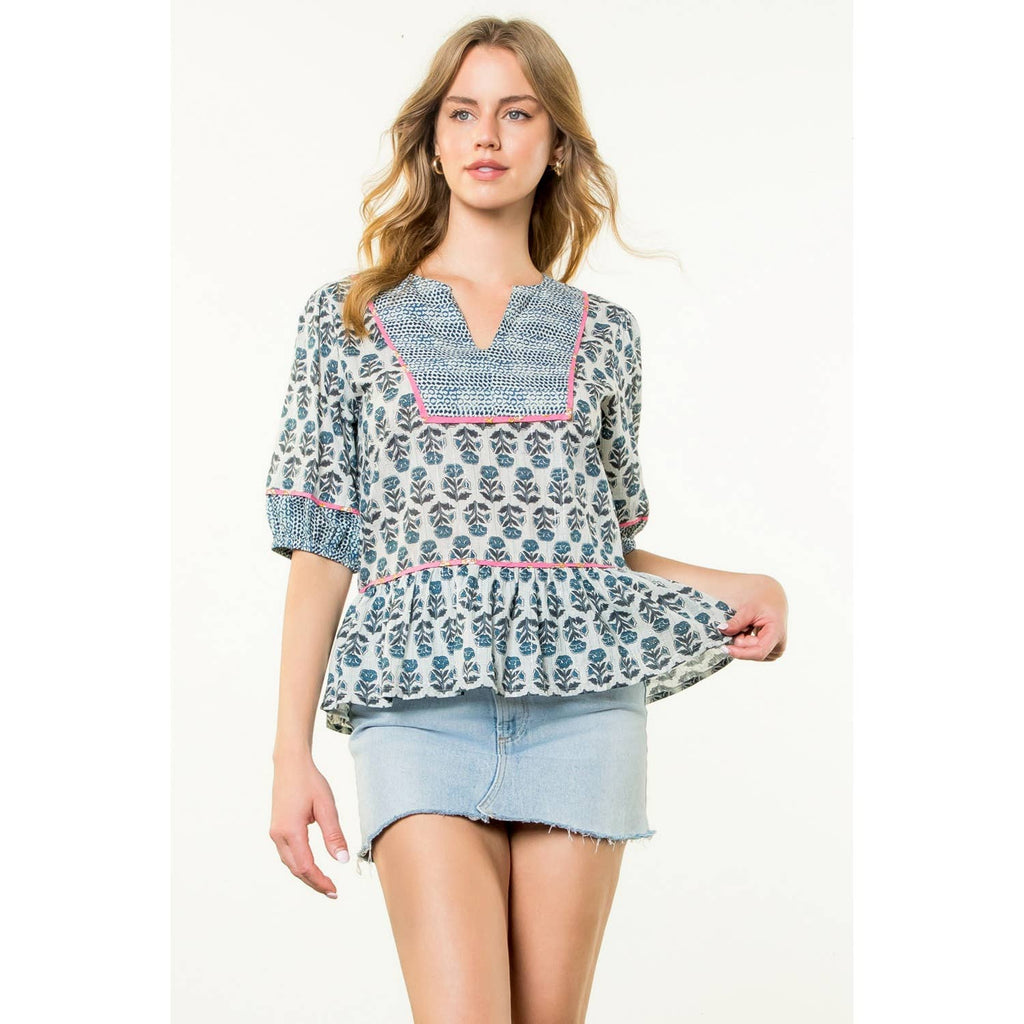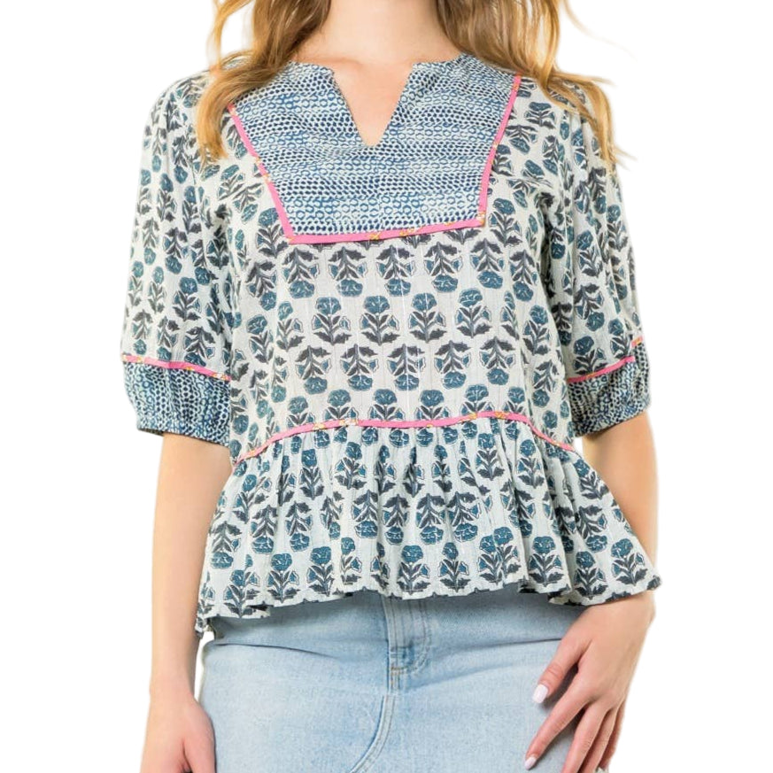 Puff Sleeve Flower Print Top. / Style Measurements for Size S / Designed in USA - Body Length: 23 1/2 in - Bust Width: 38 in - Sleeve Length: 12 3/4 in. / Model Sizes - Wearing Size S - Height 5' 9", Bust 32", Waist 25 1/2", Hips 36". / Prepack Contents - In a Pack of XS(1), S(2), M(2), and L(1) per Color Only. / Fabric Content - WOVEN / 100% Cotton